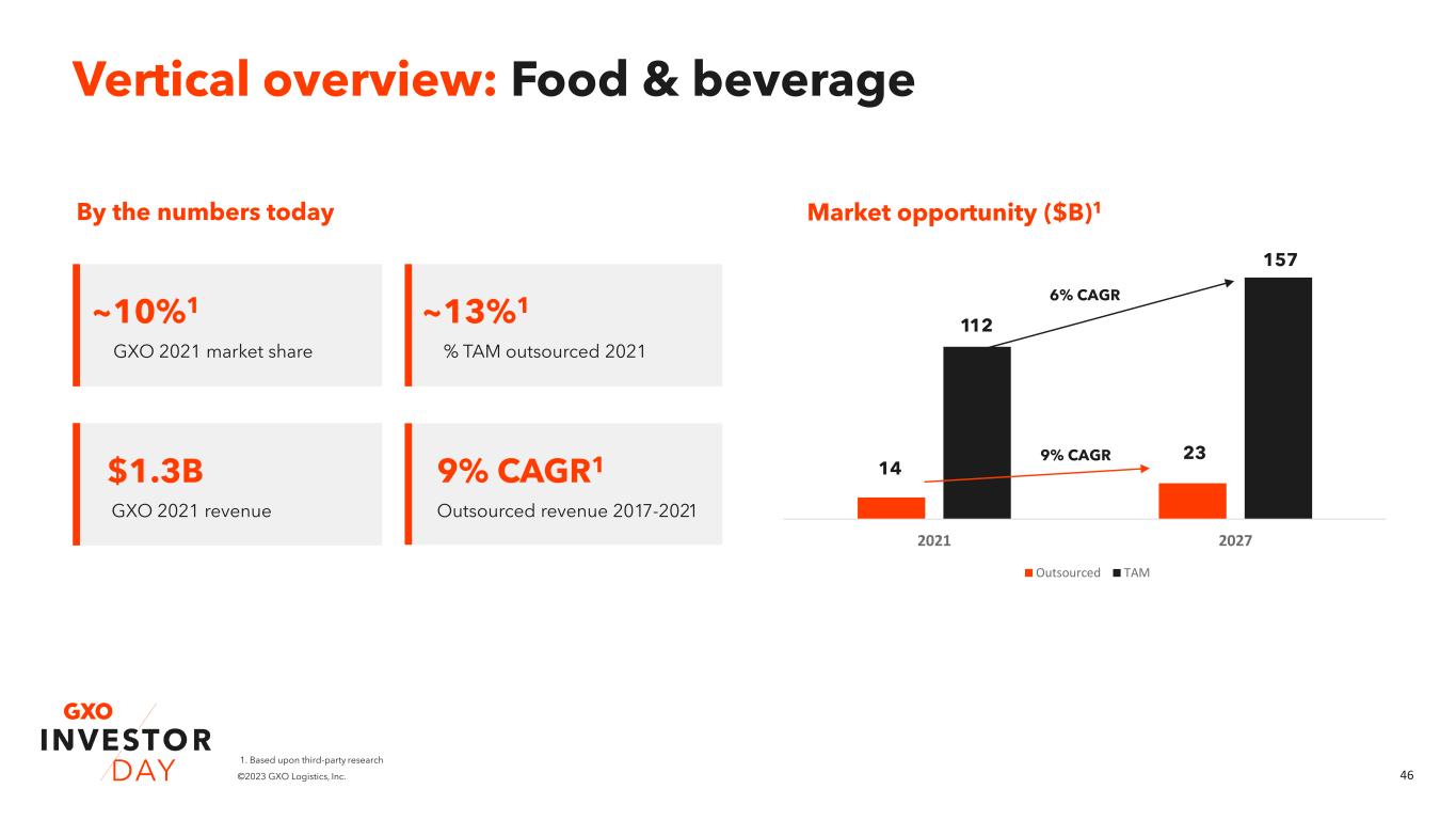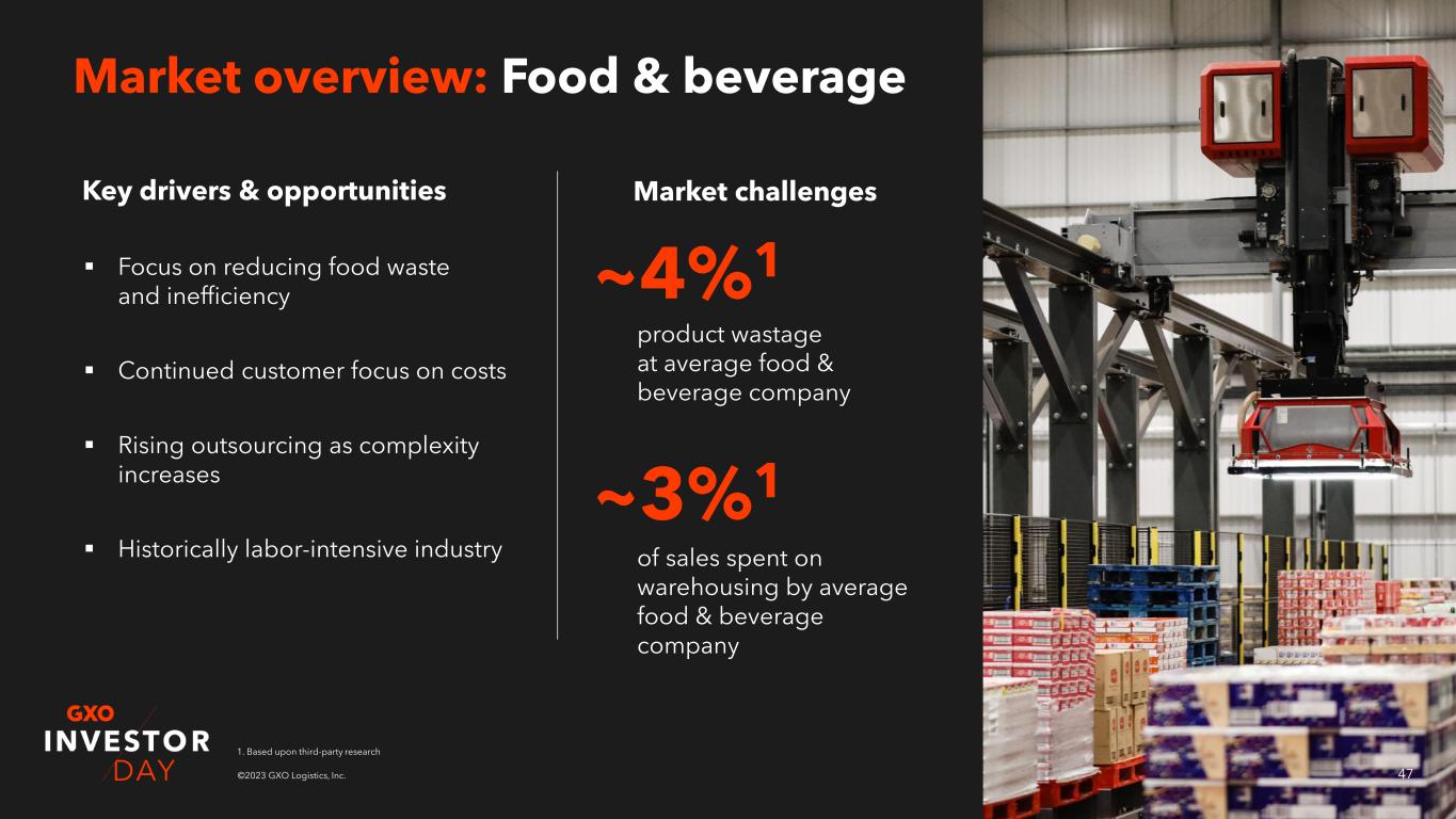 46©2023 GXO Logistics, Inc. By the numbers today Market opportunity ($B)1 Vertical overview: Food & beverage ~10%1 GXO 2021 market share $1.3B GXO 2021 revenue 9% CAGR1 Outsourced revenue 2017-2021 ~13%1 % TAM outsourced 2021 2021 2027 Outsourced TAM 112 157 14 23 6% CAGR 9% CAGR 1. Based upon third-party research
