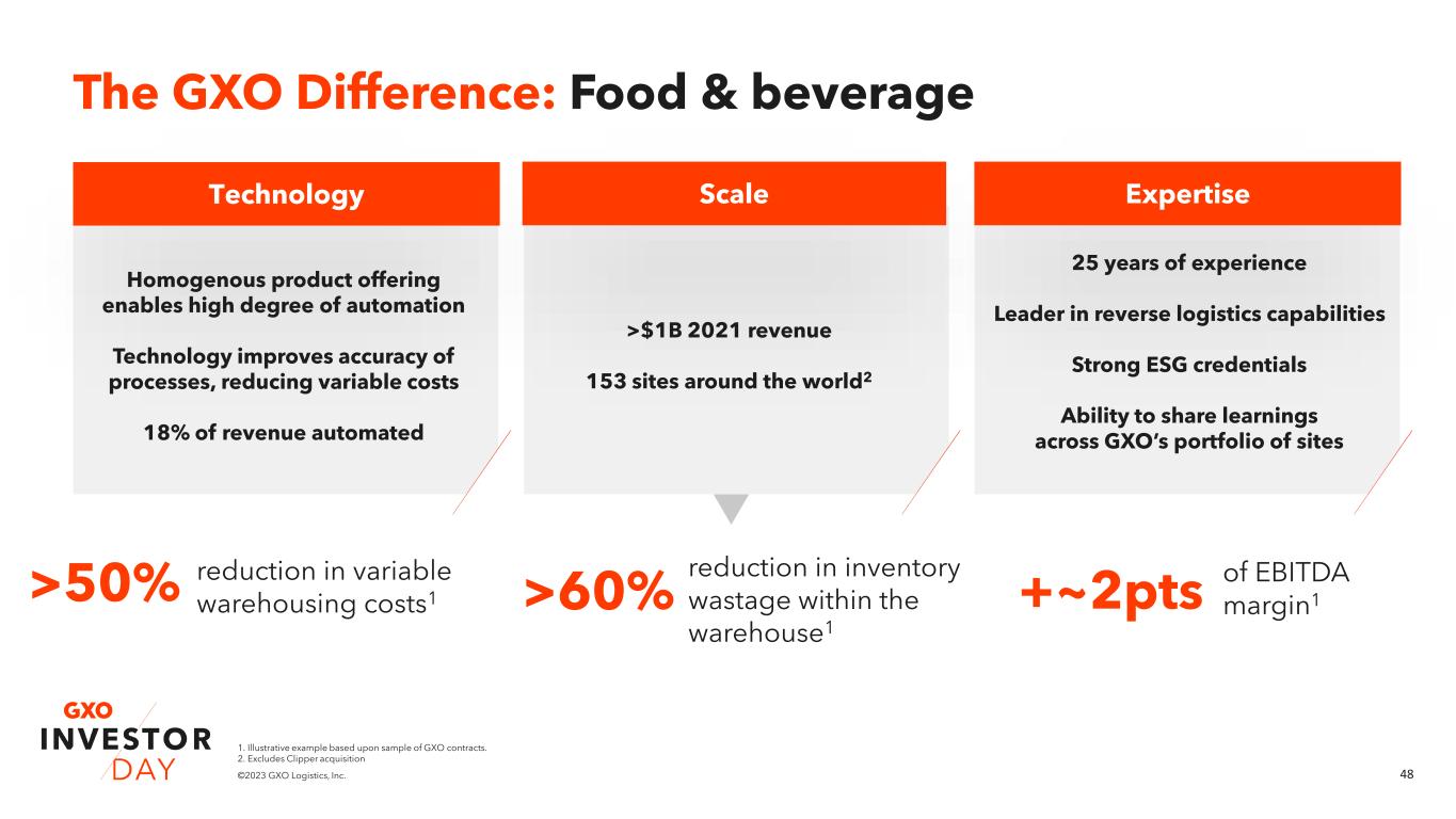 47©2023 GXO Logistics, Inc. ▪ Focus on reducing food waste and inefficiency ▪ Continued customer focus on costs ▪ Rising outsourcing as complexity increases ▪ Historically labor-intensive industry Market challenges Market overview: Food & beverage Key drivers & opportunities ~3%1 of sales spent on warehousing by average food & beverage company ~4%1 product wastage at average food & beverage company 1. Based upon third-party research