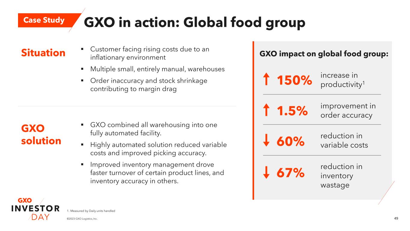 48©2023 GXO Logistics, Inc. The GXO Difference: Food & beverage Technology Scale Expertise >50% reduction in variable warehousing costs1 >60% reduction in inventory wastage within the warehouse1 +~2pts of EBITDA margin1 Homogenous product offering enables high degree of automation Technology improves accuracy of processes, reducing variable costs 18% of revenue automated >$1B 2021 revenue 153 sites around the world2 25 years of experience Leader in reverse logistics capabilities Strong ESG credentials Ability to share learnings across GXO’s portfolio of sites 1. Illustrative example based upon sample of GXO contracts. 2. Excludes Clipper acquisition