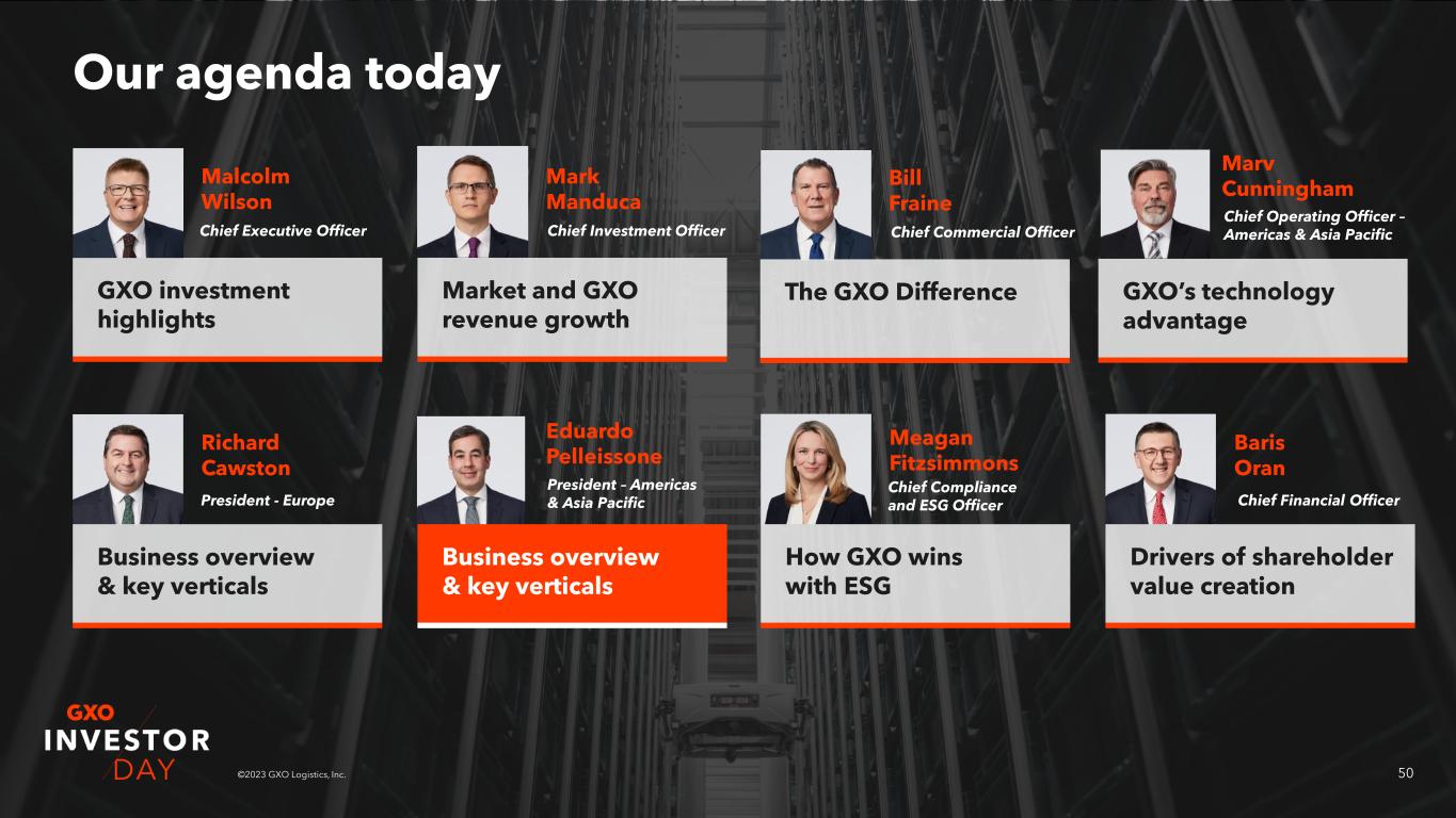 50©2023 GXO Logistics, Inc. Our agenda today GXO investment highlights Malcolm Wilson Market and GXO revenue growth Mark Manduca Richard Cawston Eduardo Pelleissone Meagan Fitzsimmons Baris Oran Chief Executive Officer Chief Investment Officer President - Europe President – Americas & Asia Pacific Chief Compliance and ESG Officer Chief Financial Officer The GXO Difference Bill Fraine Chief Commercial Officer GXO’s technology advantage Marv Cunningham Chief Operating Officer – Americas & Asia Pacific How GXO wins with ESG Drivers of shareholder value creation Business overview & key verticals Business overview & key verticals