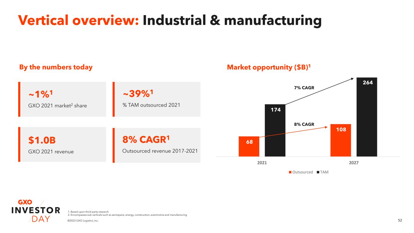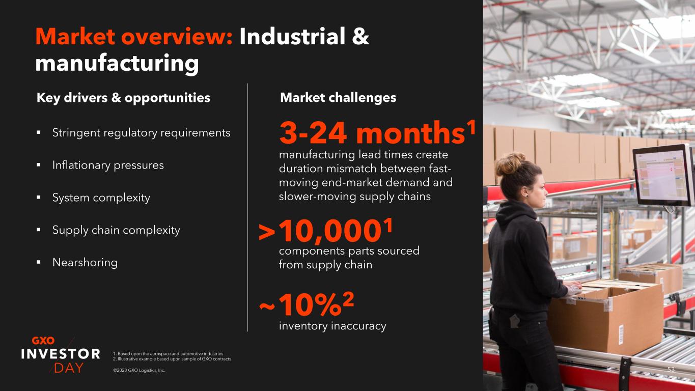 52©2023 GXO Logistics, Inc. 2021 2027 Outsourced TAM By the numbers today Market opportunity ($B)1 Vertical overview: Industrial & manufacturing 174 264 68 108 7% CAGR 8% CAGR ~1%1 GXO 2021 market2 share $1.0B GXO 2021 revenue 8% CAGR1 Outsourced revenue 2017-2021 ~39%1 % TAM outsourced 2021 1. Based upon third-party research 2. Encompasses sub-verticals such as aerospace, energy, construction, automotive and manufacturing