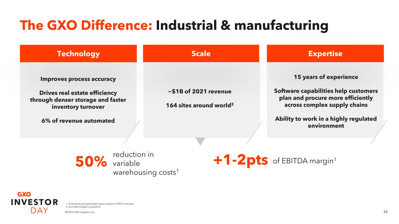 53©2023 GXO Logistics, Inc. ▪ Stringent regulatory requirements ▪ Inflationary pressures ▪ System complexity ▪ Supply chain complexity ▪ Nearshoring Market challenges Market overview: Industrial & manufacturing Key drivers & opportunities ~10%2 inventory inaccuracy 3-24 months1 manufacturing lead times create duration mismatch between fast- moving end-market demand and slower-moving supply chains 1. Based upon the aerospace and automotive industries 2. Illustrative example based upon sample of GXO contracts >10,0001 components parts sourced from supply chain