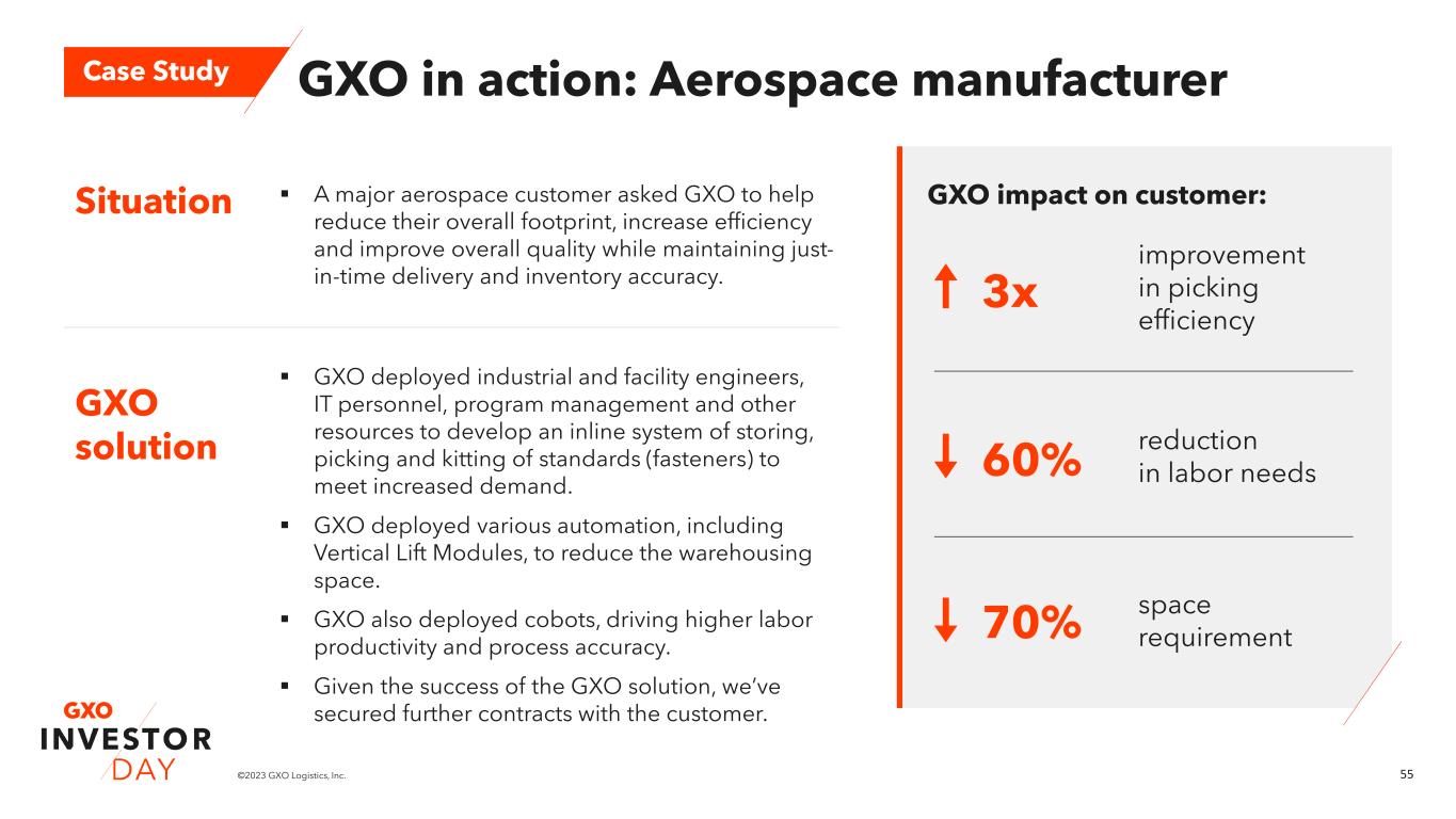 54©2023 GXO Logistics, Inc. The GXO Difference: Industrial & manufacturing Technology Scale Expertise 50% reduction in variable warehousing costs1 +1-2pts Improves process accuracy Drives real estate efficiency through denser storage and faster inventory turnover 6% of revenue automated ~$1B of 2021 revenue 164 sites around world2 15 years of experience Software capabilities help customers plan and procure more efficiently across complex supply chains Ability to work in a highly regulated environment of EBITDA margin1 1. Illustrative example based upon sample of GXO contracts. 2. Excludes Clipper acquisition
