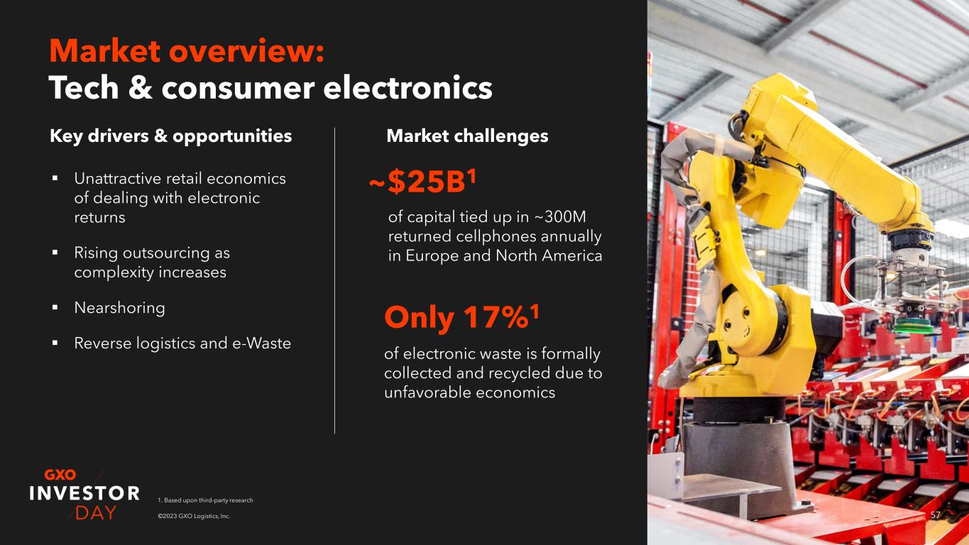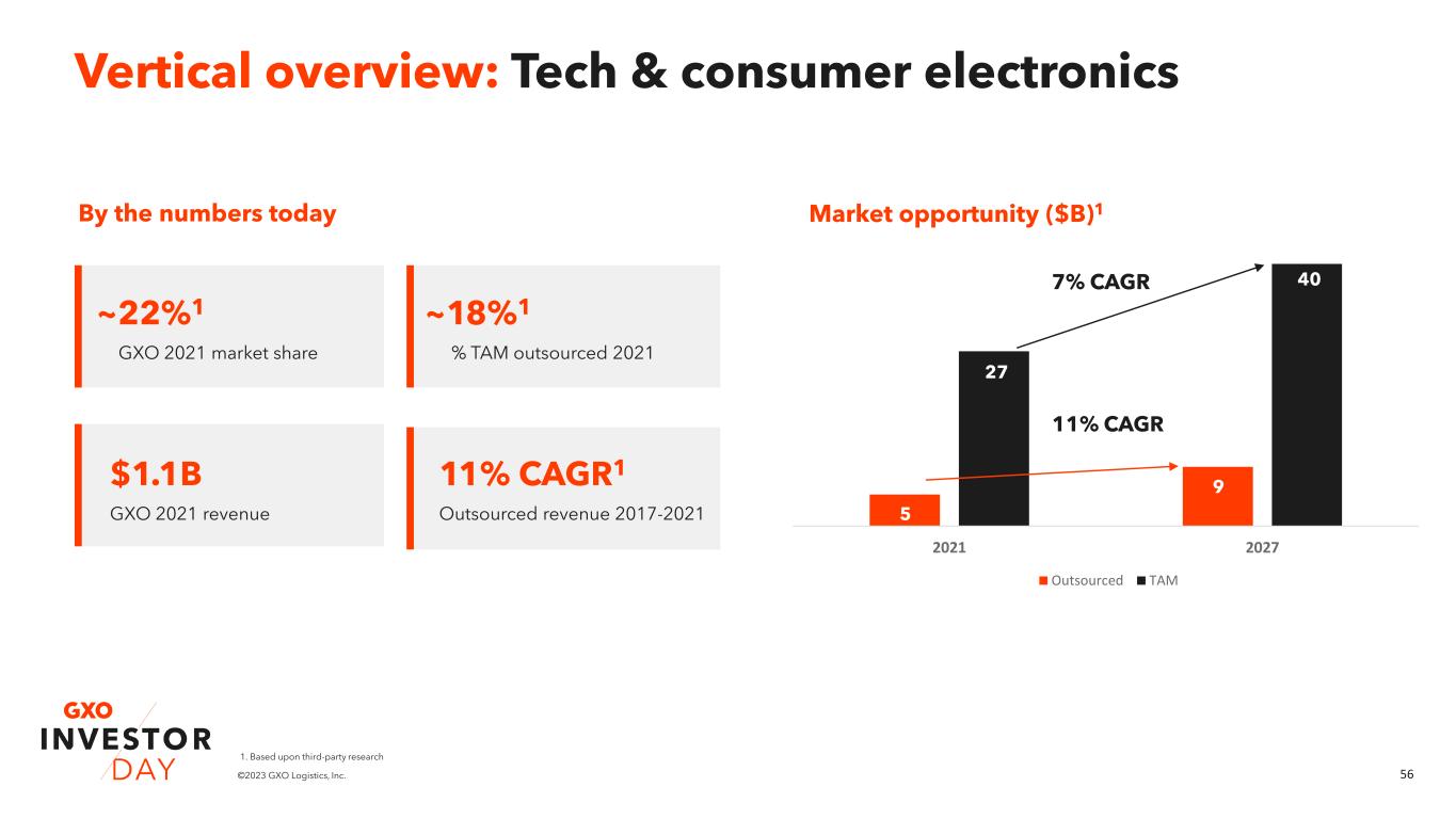 56©2023 GXO Logistics, Inc. 2021 2027 Outsourced TAM By the numbers today Market opportunity ($B)1 ~22%1 GXO 2021 market share $1.1B GXO 2021 revenue 11% CAGR1 Outsourced revenue 2017-2021 ~18%1 % TAM outsourced 2021 Vertical overview: Tech & consumer electronics 27 40 5 9 7% CAGR 11% CAGR 1. Based upon third-party research
