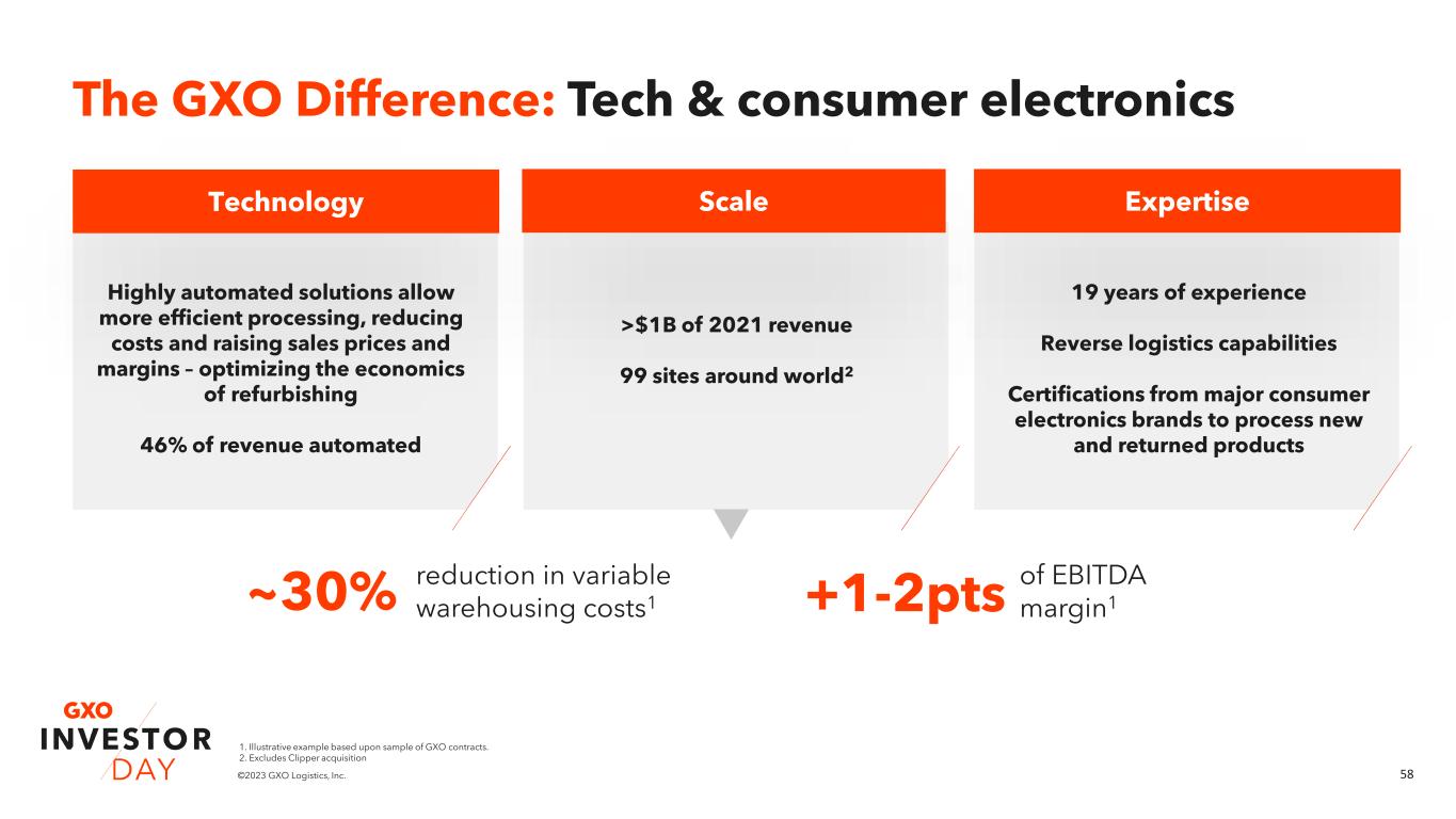 57©2023 GXO Logistics, Inc. ▪ Unattractive retail economics of dealing with electronic returns ▪ Rising outsourcing as complexity increases ▪ Nearshoring ▪ Reverse logistics and e-Waste Market challenges Market overview: Tech & consumer electronics Key drivers & opportunities ~$25B1 of capital tied up in ~300M returned cellphones annually in Europe and North America Only 17%1 of electronic waste is formally collected and recycled due to unfavorable economics 1. Based upon third-party research