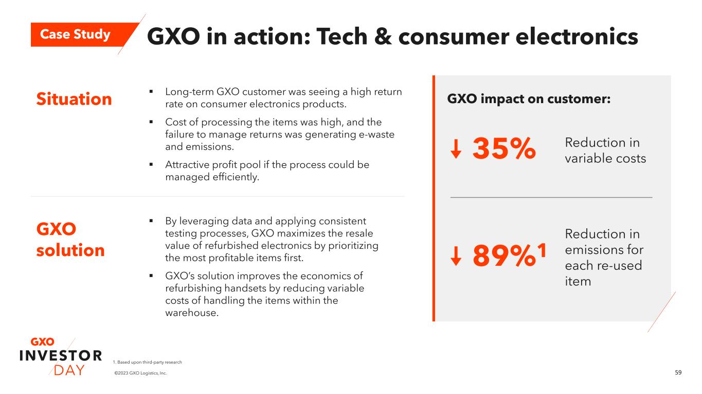 58©2023 GXO Logistics, Inc. The GXO Difference: Tech & consumer electronics Technology Scale Expertise ~30% reduction in variable warehousing costs1 +1-2pts Highly automated solutions allow more efficient processing, reducing costs and raising sales prices and margins – optimizing the economics of refurbishing 46% of revenue automated >$1B of 2021 revenue 99 sites around world2 19 years of experience Reverse logistics capabilities Certifications from major consumer electronics brands to process new and returned products of EBITDA margin1 1. Illustrative example based upon sample of GXO contracts. 2. Excludes Clipper acquisition