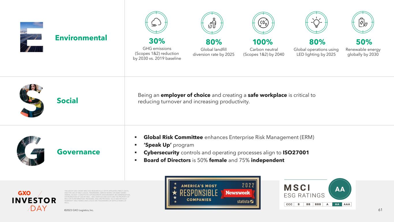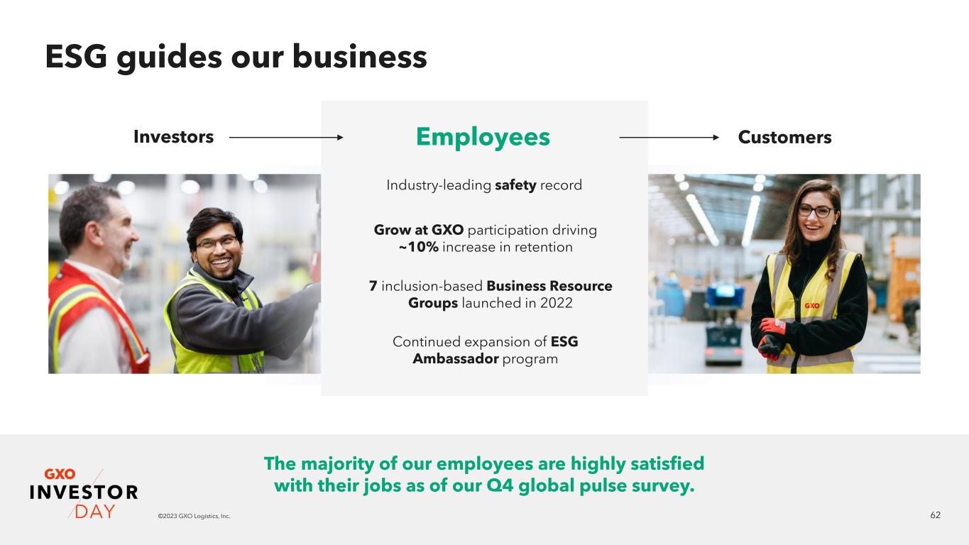 61©2023 GXO Logistics, Inc. Social Governance Environmental Being an employer of choice and creating a safe workplace is critical to reducing turnover and increasing productivity. ▪ Global Risk Committee enhances Enterprise Risk Management (ERM) ▪ ‘Speak Up’ program ▪ Cybersecurity controls and operating processes align to ISO27001 ▪ Board of Directors is 50% female and 75% independent GHG emissions (Scopes 1&2) reduction by 2030 vs. 2019 baseline 30% Global landfill diversion rate by 2025 80% Carbon neutral (Scopes 1&2) by 2040 100% Global operations using LED lighting by 2025 80% Renewable energy globally by 2030 50% THE USE BY GXO OFANY MSCI ESG RESEARCH LLC OR ITS AFFILIATES (“MSCI”) DATA, AND THE USE OF MSCI LOGOS, TRADEMARKS, SERVICE MARKS OR INDEX NAMES HEREIN, DO NOT CONSTITUTE A SPONSORSHIP, ENDORSEMENT, RECOMMENDATION, OR PROMOTION OF GXO BY MSCI. MSCI SERVICES AND DATA ARE THE PROPERTY OF MSCI OR ITS INFORMATION PROVIDERS, AND ARE PROVIDED ‘AS-IS’ AND WITHOUT WARRANTY. MSCI NAMES AND LOGOS ARE TRADEMARKS OR SERVICE MARKS OF MSCI.