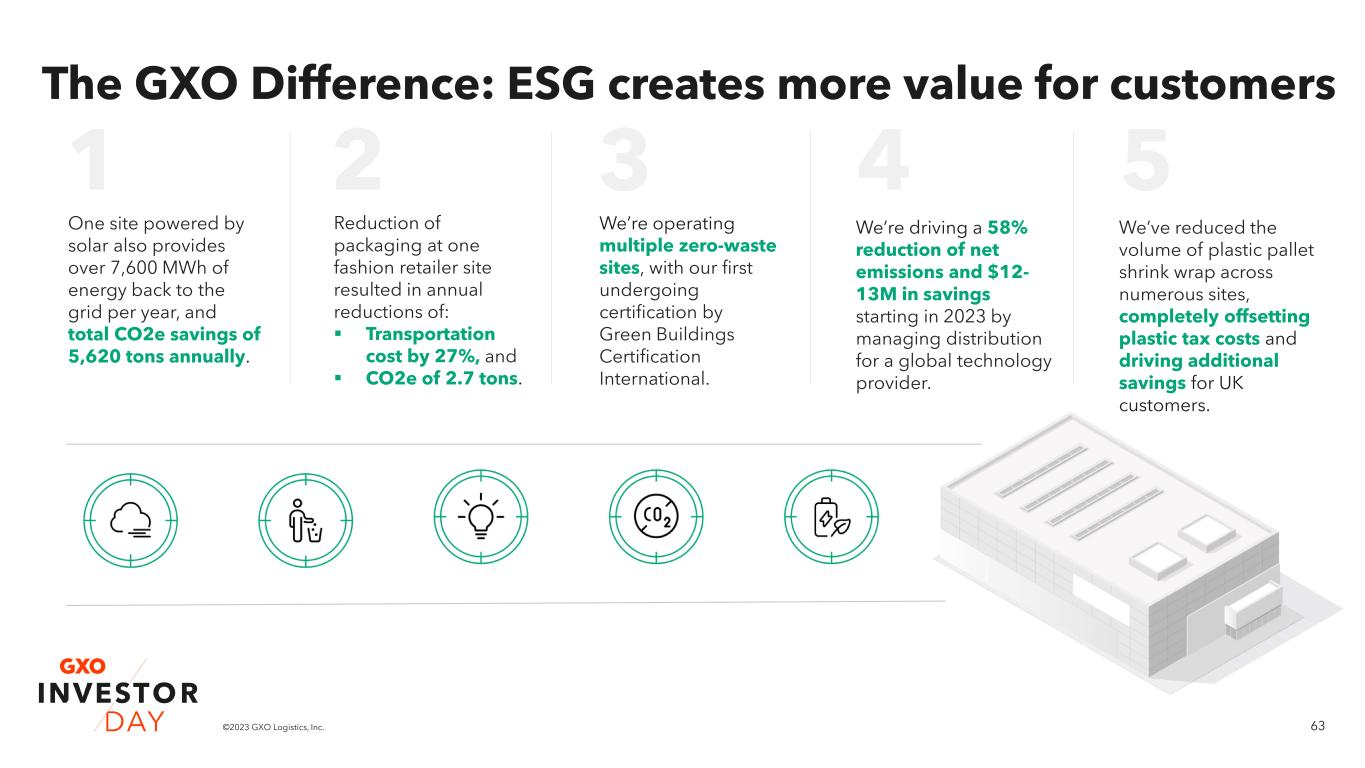 62©2023 GXO Logistics, Inc. ESG guides our business Investors Employees Customers The majority of our employees are highly satisfied with their jobs as of our Q4 global pulse survey. Industry-leading safety record Grow at GXO participation driving ~10% increase in retention 7 inclusion-based Business Resource Groups launched in 2022 Continued expansion of ESG Ambassador program