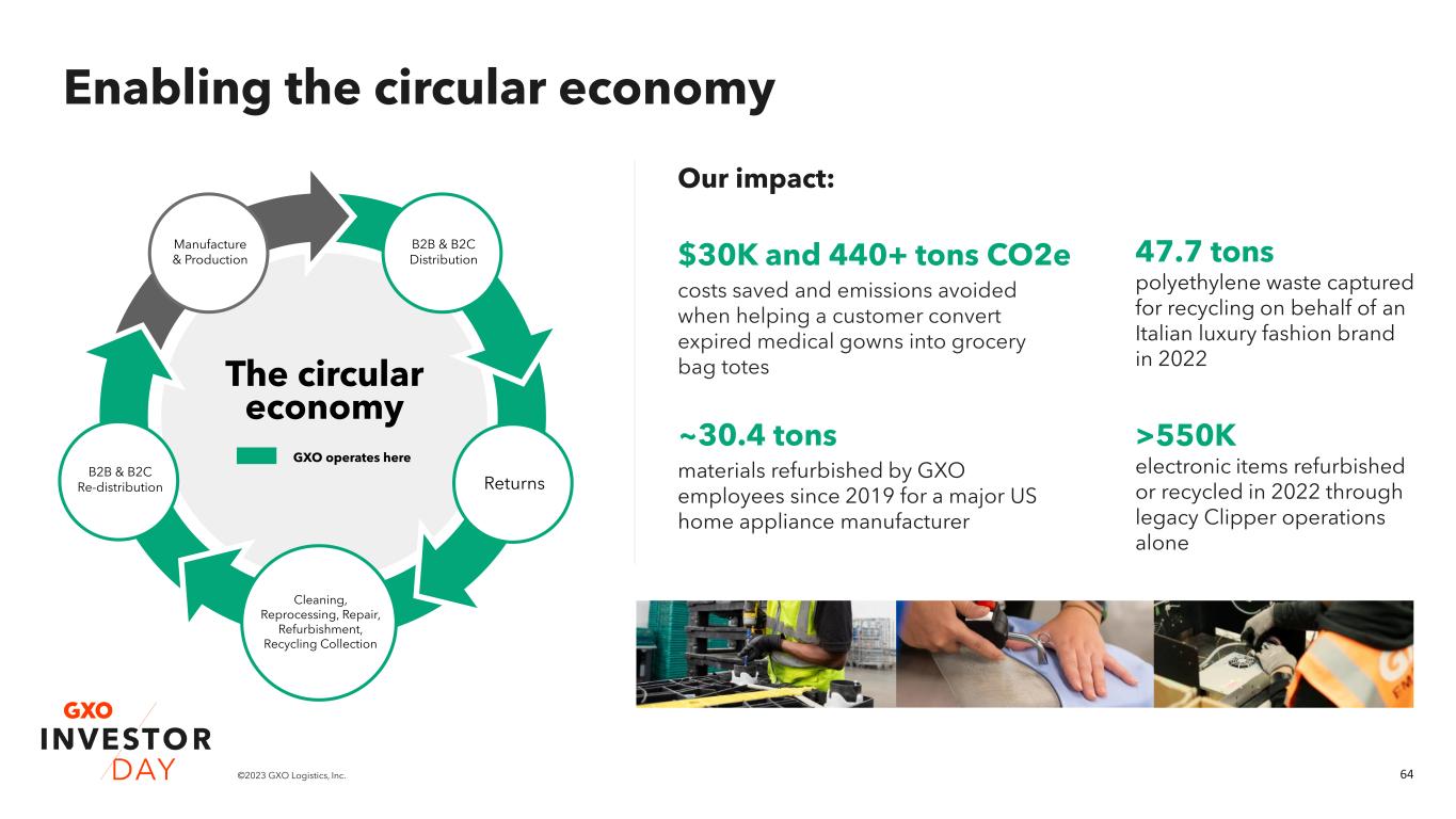 63©2023 GXO Logistics, Inc. The GXO Difference: ESG creates more value for customers One site powered by solar also provides over 7,600 MWh of energy back to the grid per year, and total CO2e savings of 5,620 tons annually. Reduction of packaging at one fashion retailer site resulted in annual reductions of: ▪ Transportation cost by 27%, and ▪ CO2e of 2.7 tons. We’re operating multiple zero-waste sites, with our first undergoing certification by Green Buildings Certification International. We’re driving a 58% reduction of net emissions and $12- 13M in savings starting in 2023 by managing distribution for a global technology provider. We’ve reduced the volume of plastic pallet shrink wrap across numerous sites, completely offsetting plastic tax costs and driving additional savings for UK customers. 1 2 3 4 5