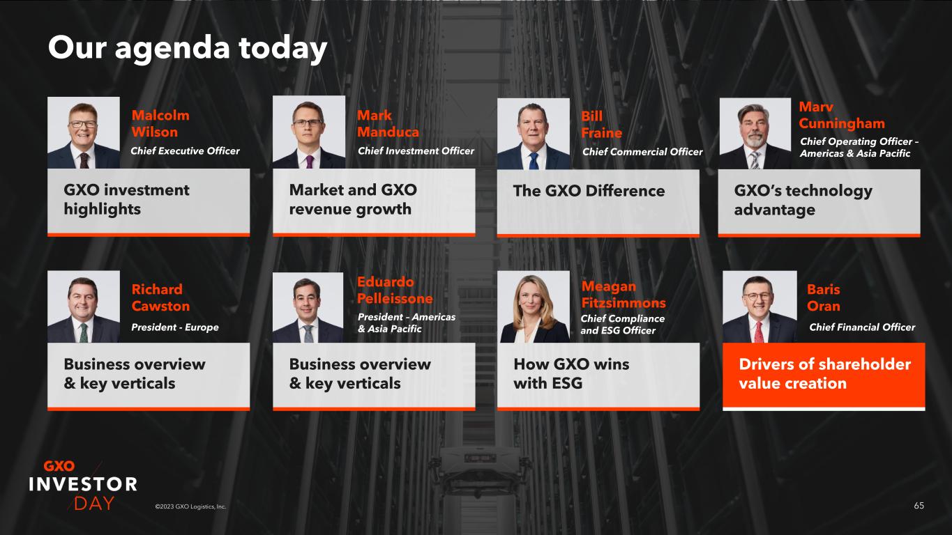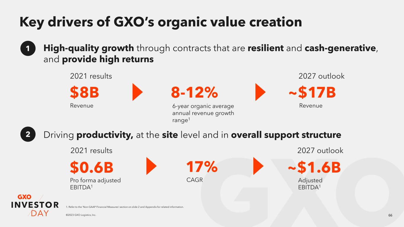 65©2023 GXO Logistics, Inc. Our agenda today GXO investment highlights Malcolm Wilson Market and GXO revenue growth Mark Manduca Richard Cawston Eduardo Pelleissone Meagan Fitzsimmons Baris Oran Chief Executive Officer Chief Investment Officer President - Europe President – Americas & Asia Pacific Chief Compliance and ESG Officer Chief Financial Officer The GXO Difference Bill Fraine Chief Commercial Officer GXO’s technology advantage Marv Cunningham Chief Operating Officer – Americas & Asia Pacific Business overview & key verticals Business overview & key verticals How GXO wins with ESG Drivers of shareholder value creation