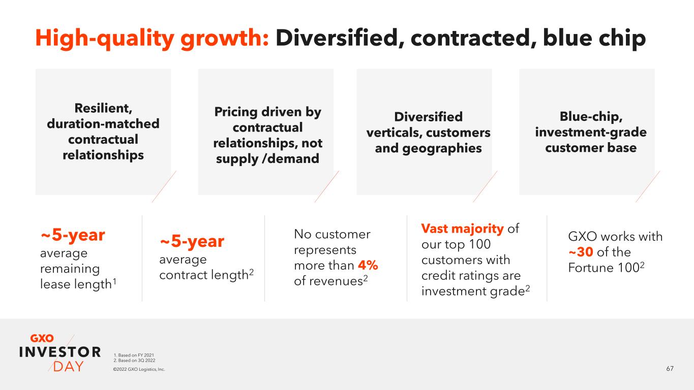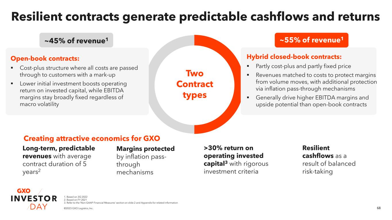 67©2023 GXO Logistics, Inc. High-quality growth: Diversified, contracted, blue chip Resilient, duration-matched contractual relationships Pricing driven by contractual relationships, not supply /demand Diversified verticals, customers and geographies Blue-chip, investment-grade customer base ~5-year average remaining lease length1 ~5-year average contract length2 No customer represents more than 4% of revenues2 Vast majority of our top 100 customers with credit ratings are investment grade2 GXO works with ~30 of the Fortune 1002 2 1. Based on FY 2021 2. Based on 3Q 2022