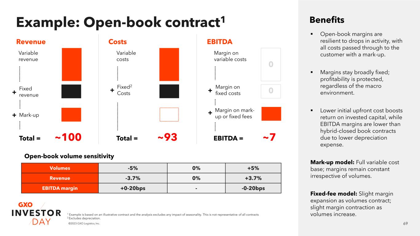 68©2023 GXO Logistics, Inc. Resilient contracts generate predictable cashflows and returns Creating attractive economics for GXO Two Contract types Open-book contracts: ▪ Cost-plus structure where all costs are passed through to customers with a mark-up ▪ Lower initial investment boosts operating return on invested capital, while EBITDA margins stay broadly fixed regardless of macro volatility Hybrid closed-book contracts: ▪ Partly cost-plus and partly fixed price ▪ Revenues matched to costs to protect margins from volume moves, with additional protection via inflation pass-through mechanisms ▪ Generally drive higher EBITDA margins and upside potential than open-book contracts Long-term, predictable revenues with average contract duration of 5 years2 Resilient cashflows as a result of balanced risk-taking Margins protected by inflation pass- through mechanisms >30% return on operating invested capital3 with rigorous investment criteria 1. Based on 3Q 2022 2. Based on FY 2021 3. Refer to the ‘Non-GAAP Financial Measures’ section on slide 2 and Appendix for related information ~45% of revenue1 ~55% of revenue1