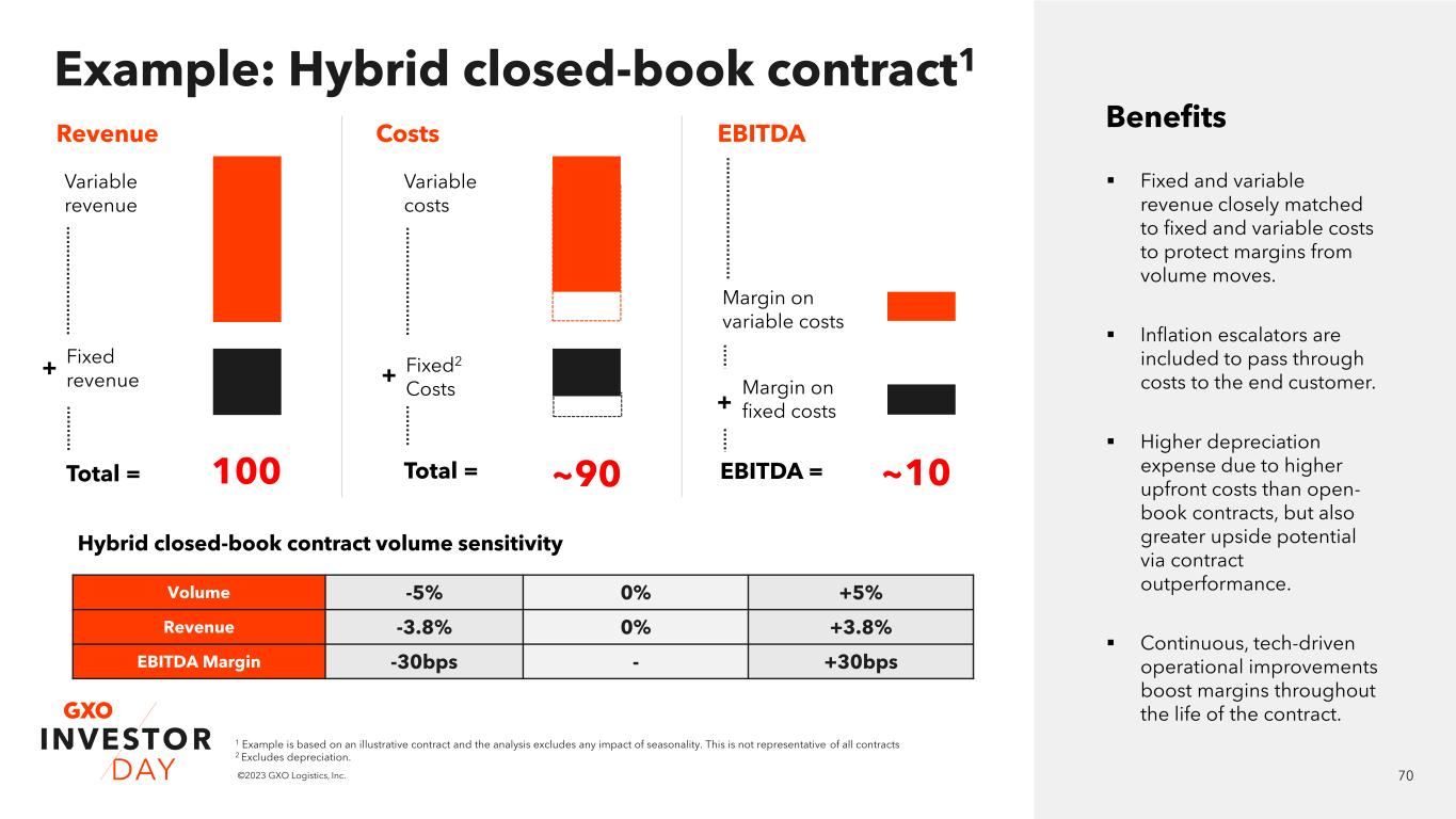 69©2023 GXO Logistics, Inc. 69 Example: Open-book contract1 ▪ Open-book margins are resilient to drops in activity, with all costs passed through to the customer with a mark-up. ▪ Margins stay broadly fixed; profitability is protected, regardless of the macro environment. ▪ Lower initial upfront cost boosts return on invested capital, while EBITDA margins are lower than hybrid-closed book contracts due to lower depreciation expense. Mark-up model: Full variable cost base; margins remain constant irrespective of volumes. Fixed-fee model: Slight margin expansion as volumes contract; slight margin contraction as volumes increase. Benefits Variable revenue Mark-up Total = ~100 + Variable costs Fixed2 Costs Total = ~93 + Margin on variable costs Fixed revenue+ Margin on mark- up or fixed fees + Margin on fixed costs+ 0 0 Open-book volume sensitivity EBITDA = ~7 Volumes -5% 0% +5% Revenue -3.7% 0% +3.7% EBITDA margin +0-20bps - -0-20bps 1 Example is based on an illustrative contract and the analysis excludes any impact of seasonality. This is not representative of all contracts 2 Excludes depreciation. Revenue Costs EBITDA