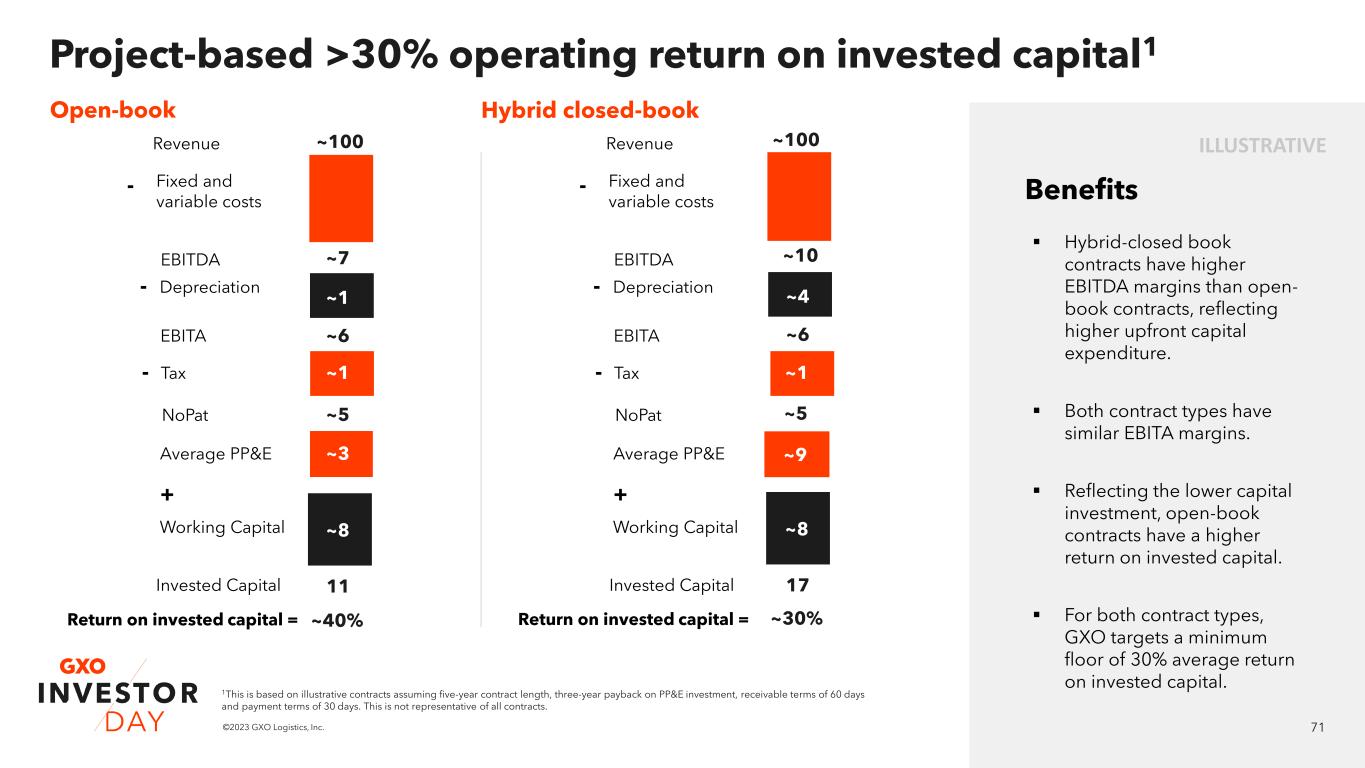 70©2023 GXO Logistics, Inc. 70 ▪ Fixed and variable revenue closely matched to fixed and variable costs to protect margins from volume moves. ▪ Inflation escalators are included to pass through costs to the end customer. ▪ Higher depreciation expense due to higher upfront costs than open- book contracts, but also greater upside potential via contract outperformance. ▪ Continuous, tech-driven operational improvements boost margins throughout the life of the contract. Example: Hybrid closed-book contract1 Benefits Revenue Costs EBITDA Variable revenue Fixed revenue Total = 100 + Variable costs Fixed2 Costs Total = ~90 + Margin on variable costs Margin on fixed costs+ EBITDA = ~10 Volume -5% 0% +5% Revenue -3.8% 0% +3.8% EBITDA Margin -30bps - +30bps Hybrid closed-book contract volume sensitivity 1 Example is based on an illustrative contract and the analysis excludes any impact of seasonality. This is not representative of all contracts 2 Excludes depreciation.