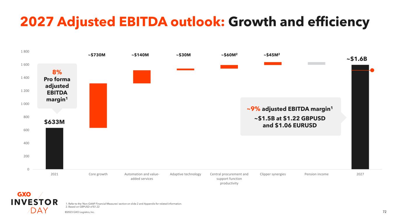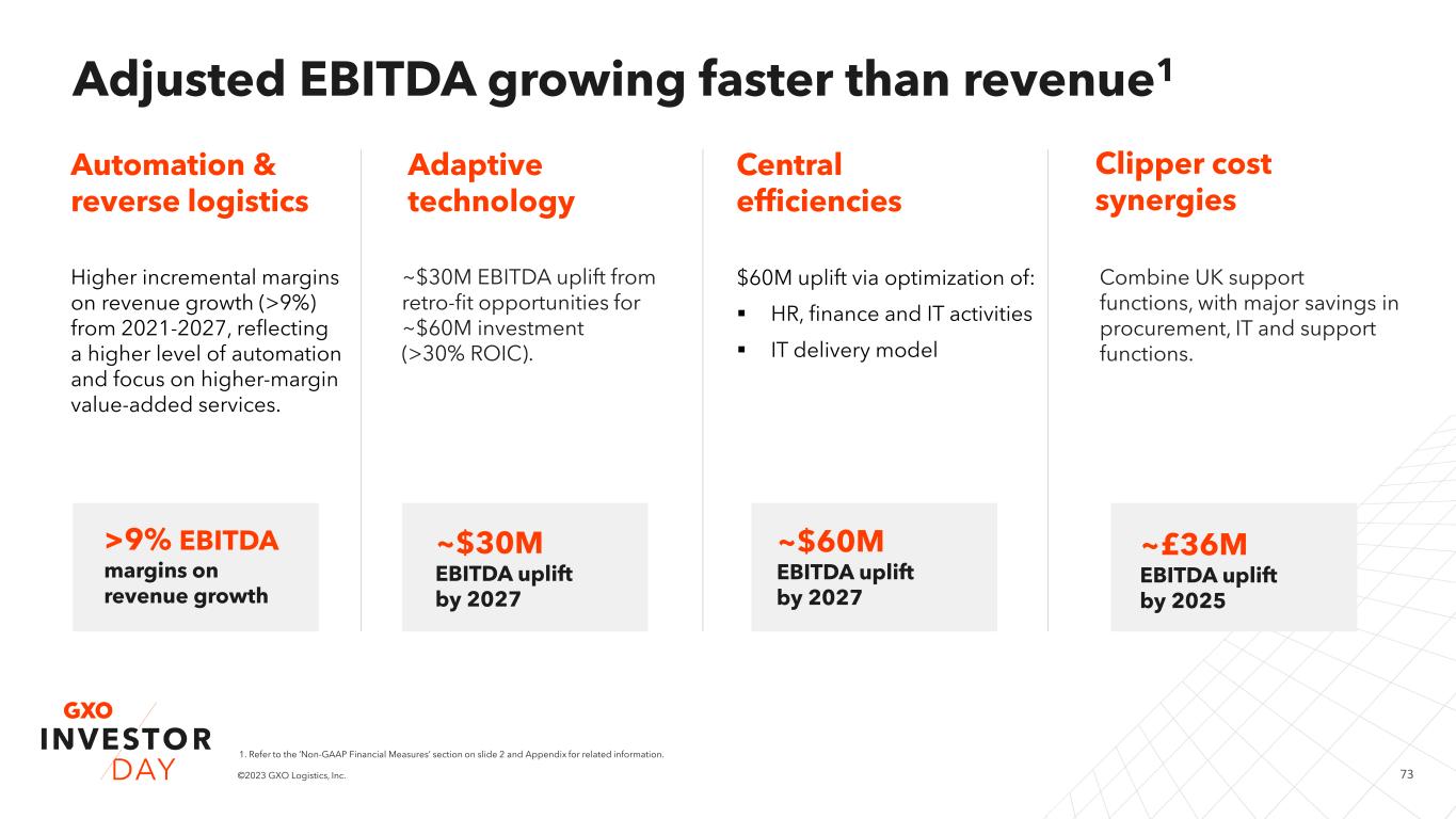 72©2023 GXO Logistics, Inc. 2027 Adjusted EBITDA outlook: Growth and efficiency 1. Refer to the ‘Non-GAAP Financial Measures’ section on slide 2 and Appendix for related information. 2. Based on GBPUSD of $1.22 0 200 400 600 800 1 000 1 200 1 400 1 600 1 800 2021 Core growth Automation and value- added services Adaptive technology Central procurement and support function productivity Clipper synergies Pension income 2027 $633M ~$1.6B 8% Pro forma adjusted EBITDA margin1 ~9% adjusted EBITDA margin1 ~$1.5B at $1.22 GBPUSD and $1.06 EURUSD ~$730M ~$140M ~$60M2~$30M ~$45M2
