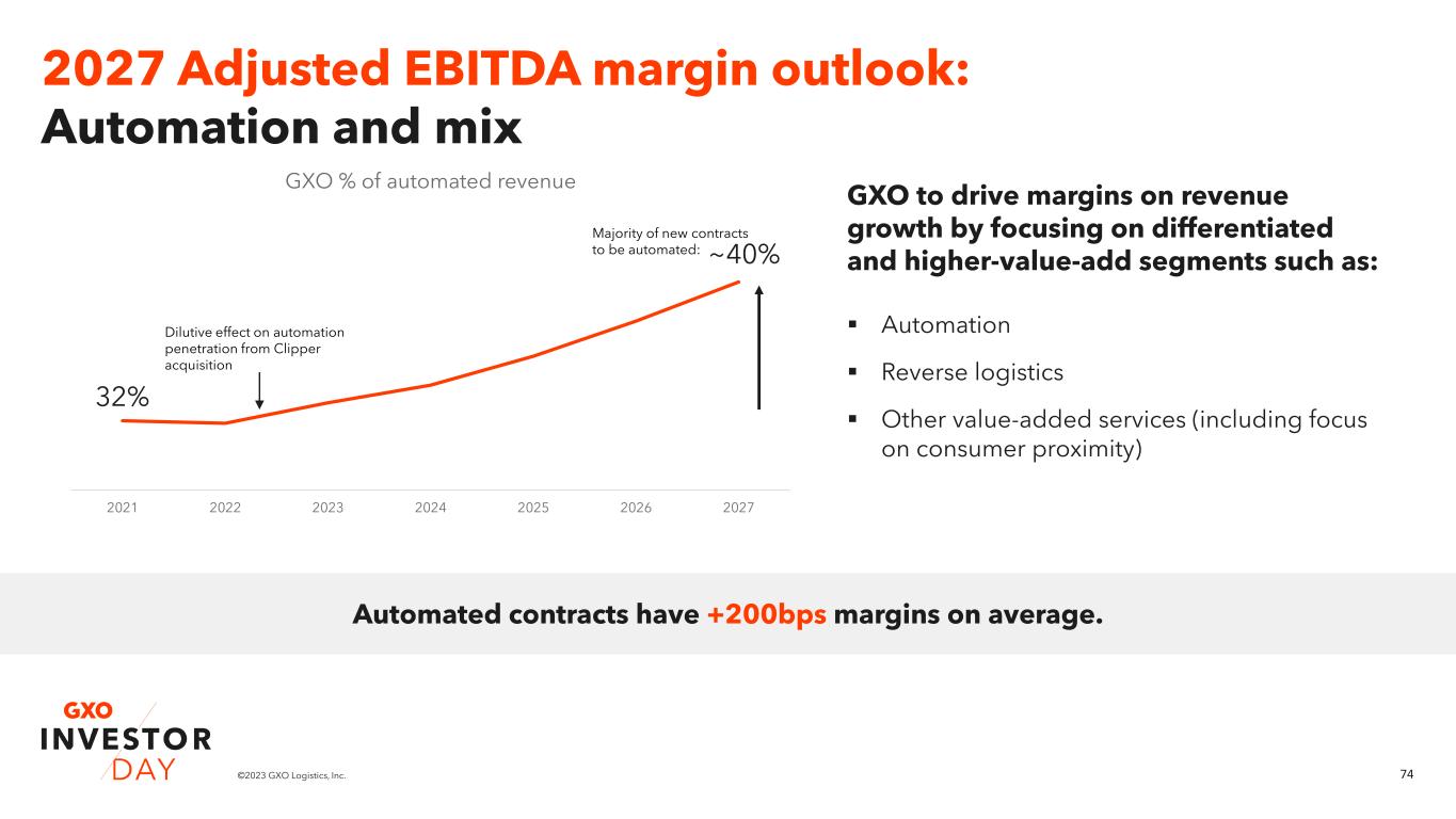 73©2023 GXO Logistics, Inc. Adjusted EBITDA growing faster than revenue1 Adaptive technology ~$30M EBITDA uplift from retro-fit opportunities for ~$60M investment (>30% ROIC). Central efficiencies $60M uplift via optimization of: ▪ HR, finance and IT activities ▪ IT delivery model Combine UK support functions, with major savings in procurement, IT and support functions. Clipper cost synergies Automation & reverse logistics Higher incremental margins on revenue growth (>9%) from 2021-2027, reflecting a higher level of automation and focus on higher-margin value-added services. ~$30M EBITDA uplift by 2027 ~$60M EBITDA uplift by 2027 >9% EBITDA margins on revenue growth ~£36M EBITDA uplift by 2025 1. Refer to the ‘Non-GAAP Financial Measures’ section on slide 2 and Appendix for related information.