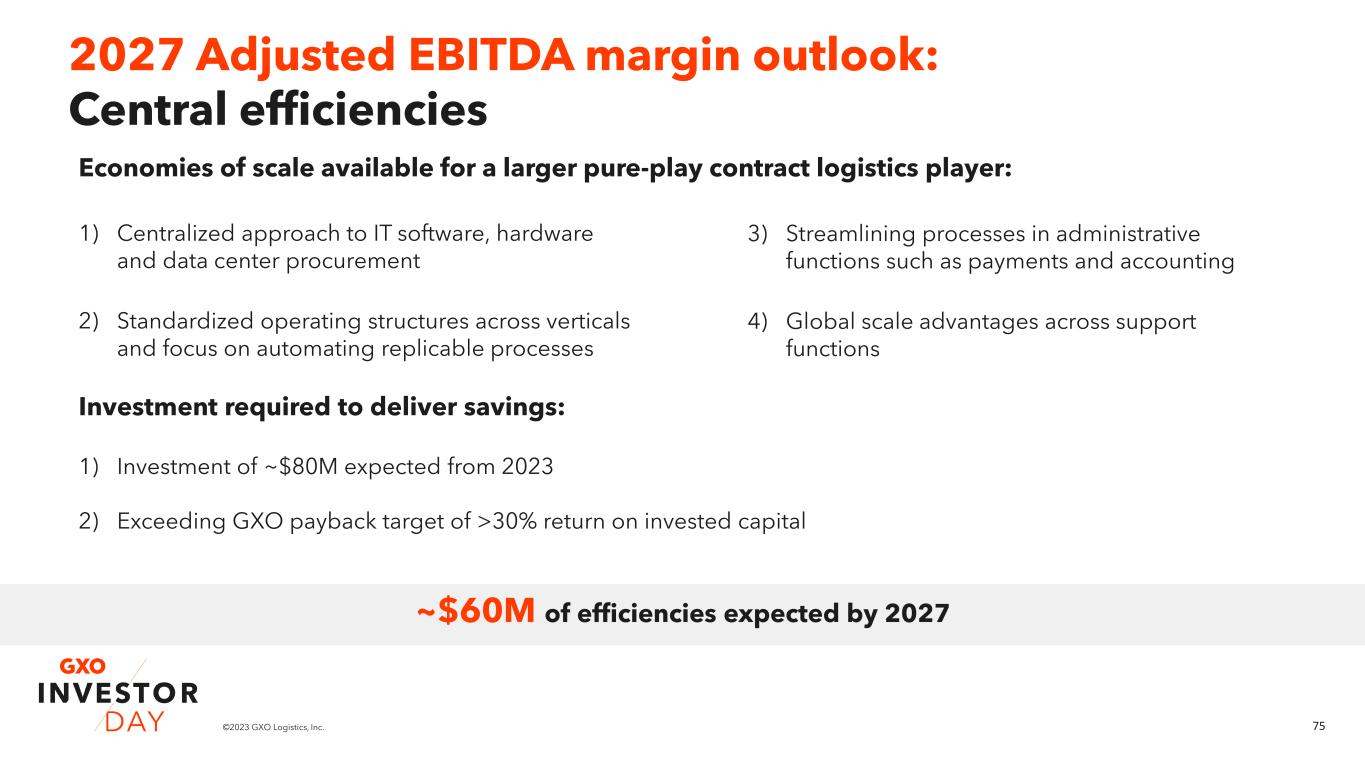 74©2023 GXO Logistics, Inc. 2027 Adjusted EBITDA margin outlook: Automation and mix Automated contracts have +200bps margins on average. 2021 2022 2023 2024 2025 2026 2027 GXO % of automated revenue Dilutive effect on automation penetration from Clipper acquisition Majority of new contracts to be automated: GXO to drive margins on revenue growth by focusing on differentiated and higher-value-add segments such as: ▪ Automation ▪ Reverse logistics ▪ Other value-added services (including focus on consumer proximity) 32% ~40%