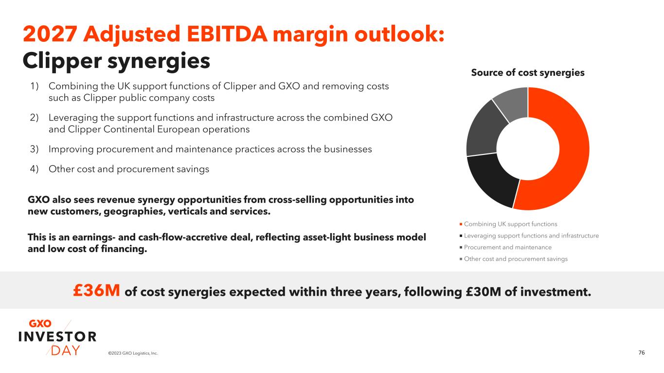 76©2023 GXO Logistics, Inc. £36M of cost synergies expected within three years, following £30M of investment. 2027 Adjusted EBITDA margin outlook: Clipper synergies GXO also sees revenue synergy opportunities from cross-selling opportunities into new customers, geographies, verticals and services. This is an earnings- and cash-flow-accretive deal, reflecting asset-light business model and low cost of financing. 1) Combining the UK support functions of Clipper and GXO and removing costs such as Clipper public company costs 2) Leveraging the support functions and infrastructure across the combined GXO and Clipper Continental European operations 3) Improving procurement and maintenance practices across the businesses 4) Other cost and procurement savings Source of cost synergies Combining UK support functions Leveraging support functions and infrastructure Procurement and maintenance Other cost and procurement savings