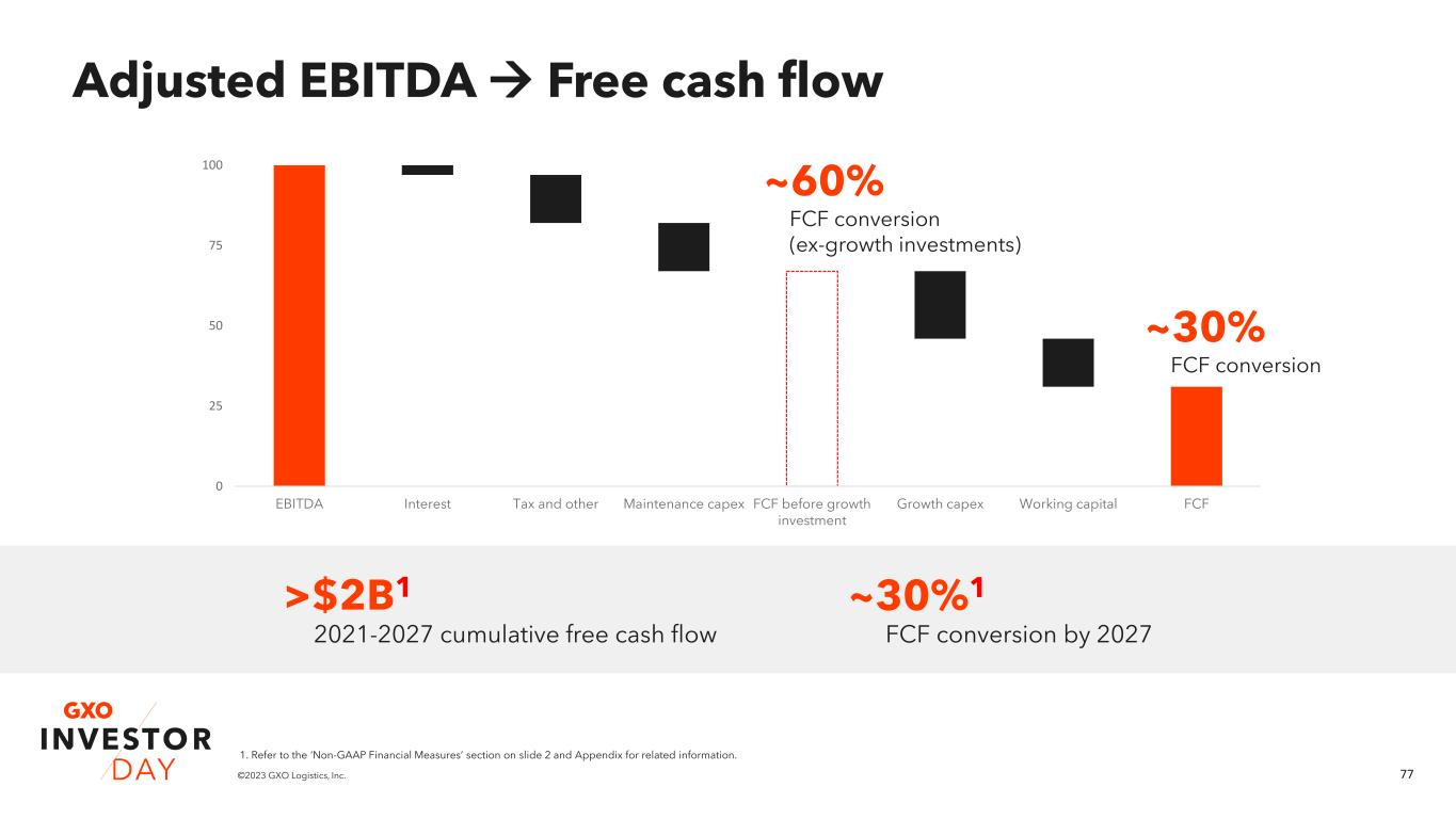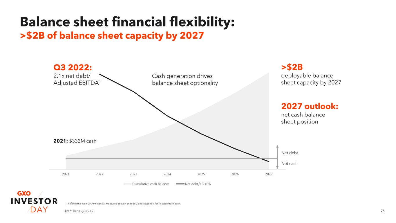 77©2023 GXO Logistics, Inc. 0 25 50 75 100 EBITDA Interest Tax and other Maintenance capex FCF before growth investment Growth capex Working capital FCF Adjusted EBITDA → Free cash flow >$2B1 2021-2027 cumulative free cash flow ~30%1 FCF conversion by 2027 ~30% FCF conversion ~60% FCF conversion (ex-growth investments) 1. Refer to the ‘Non-GAAP Financial Measures’ section on slide 2 and Appendix for related information.