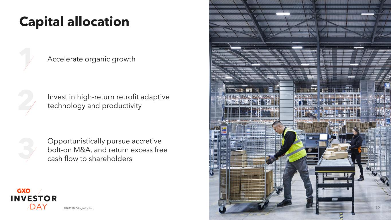 78©2023 GXO Logistics, Inc. -0.5x 0.0x 0.5x 1.0x 1.5x 2.0x 0 500 1000 1500 2000 2500 2021 2022 2023 2024 2025 2026 2027 Cumulative cash balance Net debt/EBITDA Balance sheet financial flexibility: >$2B of balance sheet capacity by 2027 >$2B deployable balance sheet capacity by 2027 Cash generation drives balance sheet optionality 1. Refer to the ‘Non-GAAP Financial Measures’ section on slide 2 and Appendix for related information. Q3 2022: 2.1x net debt/ Adjusted EBITDA1 2027 outlook: net cash balance sheet position 2021: $333M cash Net cash Net debt