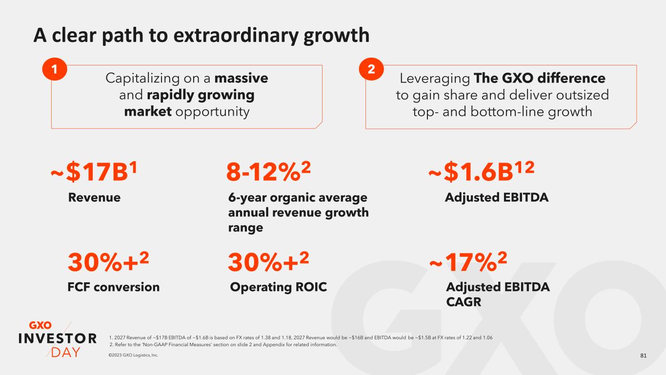 81©2023 GXO Logistics, Inc. A clear path to extraordinary growth 1. 2027 Revenue of ~$17B EBITDA of ~$1.6B is based on FX rates of 1.38 and 1.18, 2027 Revenue would be ~$16B and EBITDA would be ~$1.5B at FX rates of 1.22 and 1.06 Revenue ~$17B1 6-year organic average annual revenue growth range 8-12%2 Adjusted EBITDA ~$1.6B12 FCF conversion 30%+2 Operating ROIC 30%+2 Adjusted EBITDA CAGR ~17%2 1 2 Capitalizing on a massive and rapidly growing market opportunity Leveraging The GXO difference to gain share and deliver outsized top- and bottom-line growth 2. Refer to the ‘Non-GAAP Financial Measures’ section on slide 2 and Appendix for related information.
