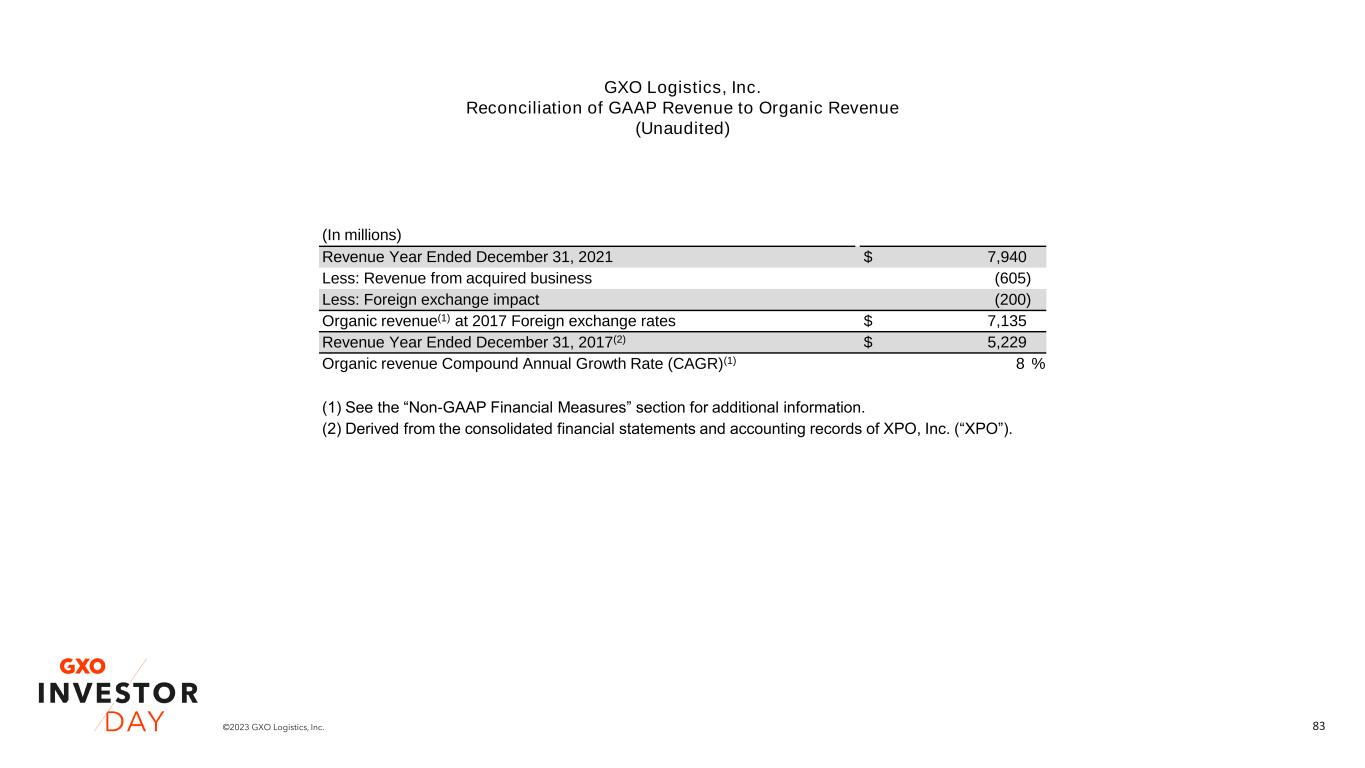 83©2023 GXO Logistics, Inc. (In millions) Revenue Year Ended December 31, 2021 $ 7,940 Less: Revenue from acquired business (605) Less: Foreign exchange impact (200) Organic revenue(1) at 2017 Foreign exchange rates $ 7,135 Revenue Year Ended December 31, 2017(2) $ 5,229 Organic revenue Compound Annual Growth Rate (CAGR)(1) 8 % (1) See the “Non-GAAP Financial Measures” section for additional information. (2) Derived from the consolidated financial statements and accounting records of XPO, Inc. (“XPO”). GXO Logistics, Inc. Reconciliation of GAAP Revenue to Organic Revenue (Unaudited)