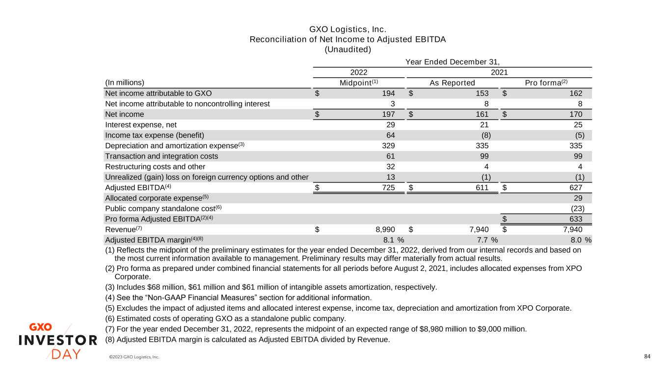 84©2023 GXO Logistics, Inc. Year Ended December 31, 2022 2021 (In millions) Midpoint(1) As Reported Pro forma(2) Net income attributable to GXO $ 194 $ 153 $ 162 Net income attributable to noncontrolling interest 3 8 8 Net income $ 197 $ 161 $ 170 Interest expense, net 29 21 25 Income tax expense (benefit) 64 (8) (5) Depreciation and amortization expense(3) 329 335 335 Transaction and integration costs 61 99 99 Restructuring costs and other 32 4 4 Unrealized (gain) loss on foreign currency options and other 13 (1) (1) Adjusted EBITDA(4) $ 725 $ 611 $ 627 Allocated corporate expense(5) 29 Public company standalone cost(6) (23) Pro forma Adjusted EBITDA(2)(4) $ 633 Revenue(7) $ 8,990 $ 7,940 $ 7,940 Adjusted EBITDA margin(4)(8) 8.1 % 7.7 % 8.0 % (1) Reflects the midpoint of the preliminary estimates for the year ended December 31, 2022, derived from our internal records and based on the most current information available to management. Preliminary results may differ materially from actual results. (2) Pro forma as prepared under combined financial statements for all periods before August 2, 2021, includes allocated expenses from XPO Corporate. (3) Includes $68 million, $61 million and $61 million of intangible assets amortization, respectively. (4) See the “Non-GAAP Financial Measures” section for additional information. (5) Excludes the impact of adjusted items and allocated interest expense, income tax, depreciation and amortization from XPO Corporate. (6) Estimated costs of operating GXO as a standalone public company. (7) For the year ended December 31, 2022, represents the midpoint of an expected range of $8,980 million to $9,000 million. (8) Adjusted EBITDA margin is calculated as Adjusted EBITDA divided by Revenue. GXO Logistics, Inc. Reconciliation of Net Income to Adjusted EBITDA (Unaudited)