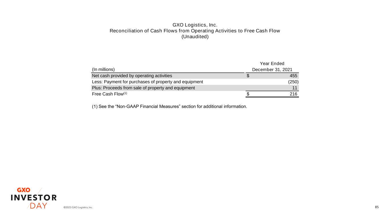 85©2023 GXO Logistics, Inc. Year Ended (In millions) December 31, 2021 Net cash provided by operating activities $ 455 Less: Payment for purchases of property and equipment (250) Plus: Proceeds from sale of property and equipment 11 Free Cash Flow(1) $ 216 (1) See the “Non-GAAP Financial Measures” section for additional information. GXO Logistics, Inc. Reconciliation of Cash Flows from Operating Activities to Free Cash Flow (Unaudited)