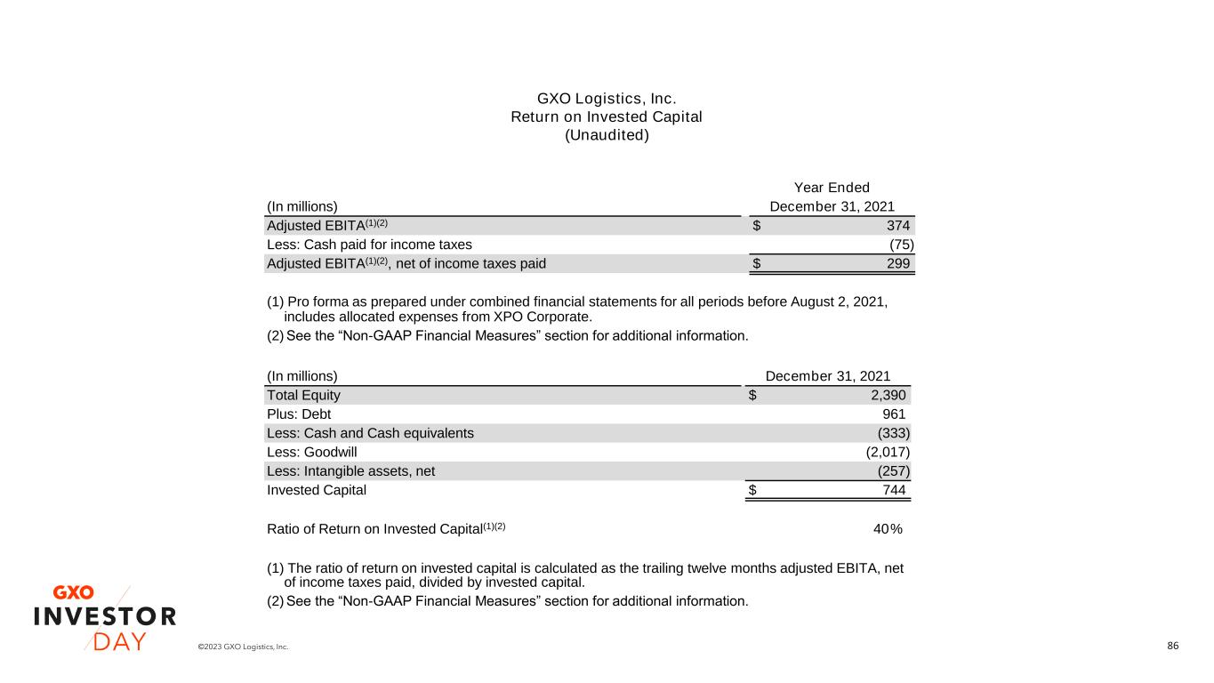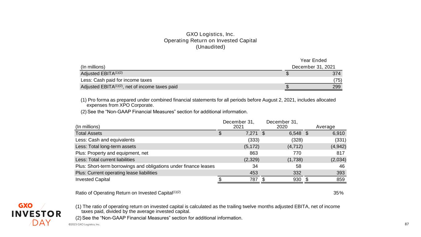 86©2023 GXO Logistics, Inc. Year Ended (In millions) December 31, 2021 Adjusted EBITA(1)(2) $ 374 Less: Cash paid for income taxes (75) Adjusted EBITA(1)(2), net of income taxes paid $ 299 (1) Pro forma as prepared under combined financial statements for all periods before August 2, 2021, includes allocated expenses from XPO Corporate. (2) See the “Non-GAAP Financial Measures” section for additional information. (In millions) December 31, 2021 Total Equity $ 2,390 Plus: Debt 961 Less: Cash and Cash equivalents (333) Less: Goodwill (2,017) Less: Intangible assets, net (257) Invested Capital $ 744 Ratio of Return on Invested Capital(1)(2) 40% (1) The ratio of return on invested capital is calculated as the trailing twelve months adjusted EBITA, net of income taxes paid, divided by invested capital. (2) See the “Non-GAAP Financial Measures” section for additional information. GXO Logistics, Inc. Return on Invested Capital (Unaudited)