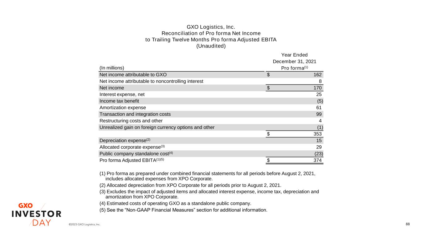 88©2023 GXO Logistics, Inc. Year Ended December 31, 2021 (In millions) Pro forma(1) Net income attributable to GXO $ 162 Net income attributable to noncontrolling interest 8 Net income $ 170 Interest expense, net 25 Income tax benefit (5) Amortization expense 61 Transaction and integration costs 99 Restructuring costs and other 4 Unrealized gain on foreign currency options and other (1) $ 353 Depreciation expense(2) 15 Allocated corporate expense(3) 29 Public company standalone cost(4) (23) Pro forma Adjusted EBITA(1)(5) $ 374 (1) Pro forma as prepared under combined financial statements for all periods before August 2, 2021, includes allocated expenses from XPO Corporate. (2) Allocated depreciation from XPO Corporate for all periods prior to August 2, 2021. (3) Excludes the impact of adjusted items and allocated interest expense, income tax, depreciation and amortization from XPO Corporate. (4) Estimated costs of operating GXO as a standalone public company. (5) See the “Non-GAAP Financial Measures” section for additional information. GXO Logistics, Inc. Reconciliation of Pro forma Net Income to Trailing Twelve Months Pro forma Adjusted EBITA (Unaudited)