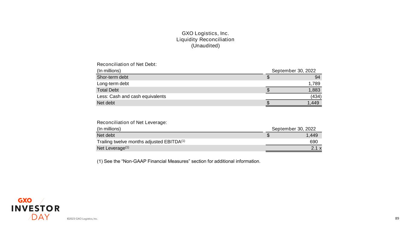 89©2023 GXO Logistics, Inc. GXO Logistics, Inc. Liquidity Reconciliation (Unaudited) Reconciliation of Net Debt: (In millions) September 30, 2022 Shor-term debt $ 94 Long-term debt 1,789 Total Debt $ 1,883 Less: Cash and cash equivalents (434) Net debt $ 1,449 Reconciliation of Net Leverage: (In millions) September 30, 2022 Net debt $ 1,449 Trailing twelve months adjusted EBITDA(1) 690 Net Leverage(1) 2.1 x (1) See the “Non-GAAP Financial Measures” section for additional information.