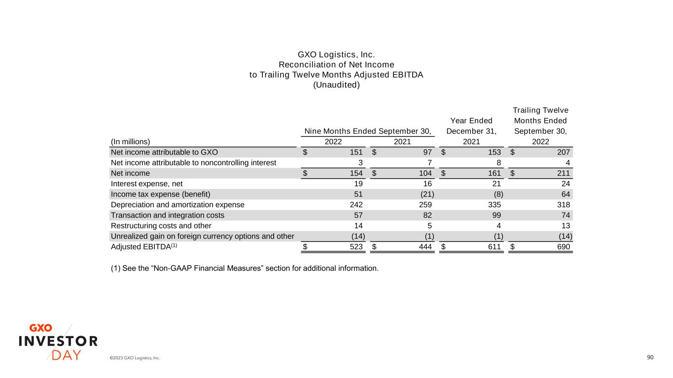 90©2023 GXO Logistics, Inc. GXO Logistics, Inc. Reconciliation of Net Income to Trailing Twelve Months Adjusted EBITDA (Unaudited) Trailing Twelve Year Ended Months Ended Nine Months Ended September 30, December 31, September 30, (In millions) 2022 2021 2021 2022 Net income attributable to GXO $ 151 $ 97 $ 153 $ 207 Net income attributable to noncontrolling interest 3 7 8 4 Net income $ 154 $ 104 $ 161 $ 211 Interest expense, net 19 16 21 24 Income tax expense (benefit) 51 (21) (8) 64 Depreciation and amortization expense 242 259 335 318 Transaction and integration costs 57 82 99 74 Restructuring costs and other 14 5 4 13 Unrealized gain on foreign currency options and other (14) (1) (1) (14) Adjusted EBITDA(1) $ 523 $ 444 $ 611 $ 690 (1) See the “Non-GAAP Financial Measures” section for additional information.