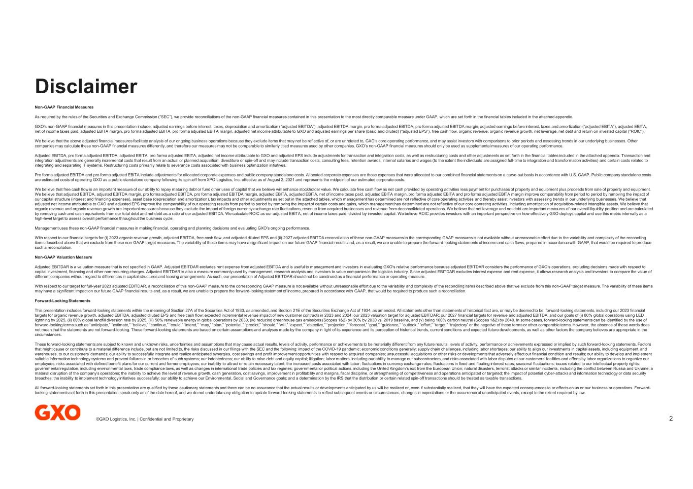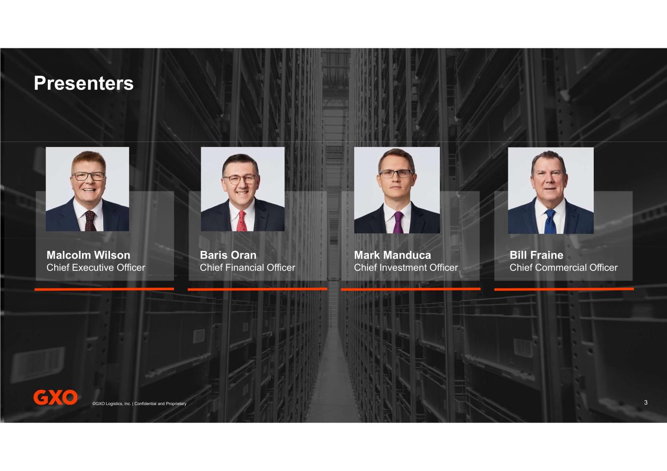 2©GXO Logistics, Inc. | Confidential and Proprietary Disclaimer 2 Non-GAAP Financial Measures As required by the rules of the Securities and Exchange Commission (“SEC”), we provide reconciliations of the non-GAAP financial measures contained in this presentation to the most directly comparable measure under GAAP, which are set forth in the financial tables included in the attached appendix. GXO’s non-GAAP financial measures in this presentation include: adjusted earnings before interest, taxes, depreciation and amortization (“adjusted EBITDA”), adjusted EBITDA margin, pro forma adjusted EBITDA, pro forma adjusted EBITDA margin, adjusted earnings before interest, taxes and amortization (“adjusted EBITA”), adjusted EBITA, net of income taxes paid, adjusted EBITA margin, pro forma adjusted EBITA, pro forma adjusted EBITA margin, adjusted net income attributable to GXO and adjusted earnings per share (basic and diluted) (“adjusted EPS”), free cash flow, organic revenue, organic revenue growth, net leverage, net debt and return on invested capital (“ROIC”). We believe that the above adjusted financial measures facilitate analysis of our ongoing business operations because they exclude items that may not be reflective of, or are unrelated to, GXO’s core operating performance, and may assist investors with comparisons to prior periods and assessing trends in our underlying businesses. Other companies may calculate these non-GAAP financial measures differently, and therefore our measures may not be comparable to similarly titled measures used by other companies. GXO’s non-GAAP financial measures should only be used as supplemental measures of our operating performance. Adjusted EBITDA, pro forma adjusted EBITDA, adjusted EBITA, pro forma adjusted EBITA, adjusted net income attributable to GXO and adjusted EPS include adjustments for transaction and integration costs, as well as restructuring costs and other adjustments as set forth in the financial tables included in the attached appendix. Transaction and integration adjustments are generally incremental costs that result from an actual or planned acquisition, divestiture or spin-off and may include transaction costs, consulting fees, retention awards, internal salaries and wages (to the extent the individuals are assigned full-time to integration and transformation activities) and certain costs related to integrating and separating IT systems. Restructuring costs primarily relate to severance costs associated with business optimization initiatives. Pro forma adjusted EBITDA and pro forma adjusted EBITA include adjustments for allocated corporate expenses and public company standalone costs. Allocated corporate expenses are those expenses that were allocated to our combined financial statements on a carve-out basis in accordance with U.S. GAAP. Public company standalone costs are estimated costs of operating GXO as a public standalone company following its spin-off from XPO Logistics, Inc. effective as of August 2, 2021 and represents the midpoint of our estimated corporate costs. We believe that free cash flow is an important measure of our ability to repay maturing debt or fund other uses of capital that we believe will enhance stockholder value. We calculate free cash flow as net cash provided by operating activities less payment for purchases of property and equipment plus proceeds from sale of property and equipment. We believe that adjusted EBITDA, adjusted EBITDA margin, pro forma adjusted EBITDA, pro forma adjusted EBITDA margin, adjusted EBITA, adjusted EBITA, net of income taxes paid, adjusted EBITA margin, pro forma adjusted EBITA and pro forma adjusted EBITA margin improve comparability from period to period by removing the impact of our capital structure (interest and financing expenses), asset base (depreciation and amortization), tax impacts and other adjustments as set out in the attached tables, which management has determined are not reflective of core operating activities and thereby assist investors with assessing trends in our underlying businesses. We believe that adjusted net income attributable to GXO and adjusted EPS improve the comparability of our operating results from period to period by removing the impact of certain costs and gains, which management has determined are not reflective of our core operating activities, including amortization of acquisition-related intangible assets. We believe that organic revenue and organic revenue growth are important measures because they exclude the impact of foreign currency exchange rate fluctuations, revenue from acquired businesses and revenue from deconsolidated operations. We believe that net leverage and net debt are important measures of our overall liquidity position and are calculated by removing cash and cash equivalents from our total debt and net debt as a ratio of our adjusted EBITDA. We calculate ROIC as our adjusted EBITA, net of income taxes paid, divided by invested capital. We believe ROIC provides investors with an important perspective on how effectively GXO deploys capital and use this metric internally as a high-level target to assess overall performance throughout the business cycle. Management uses these non-GAAP financial measures in making financial, operating and planning decisions and evaluating GXO’s ongoing performance. With respect to our financial targets for (i) 2023 organic revenue growth, adjusted EBITDA, free cash flow, and adjusted diluted EPS and (ii) 2027 adjusted EBITDA reconciliation of these non-GAAP measures to the corresponding GAAP measures is not available without unreasonable effort due to the variability and complexity of the reconciling items described above that we exclude from these non-GAAP target measures. The variability of these items may have a significant impact on our future GAAP financial results and, as a result, we are unable to prepare the forward-looking statements of income and cash flow