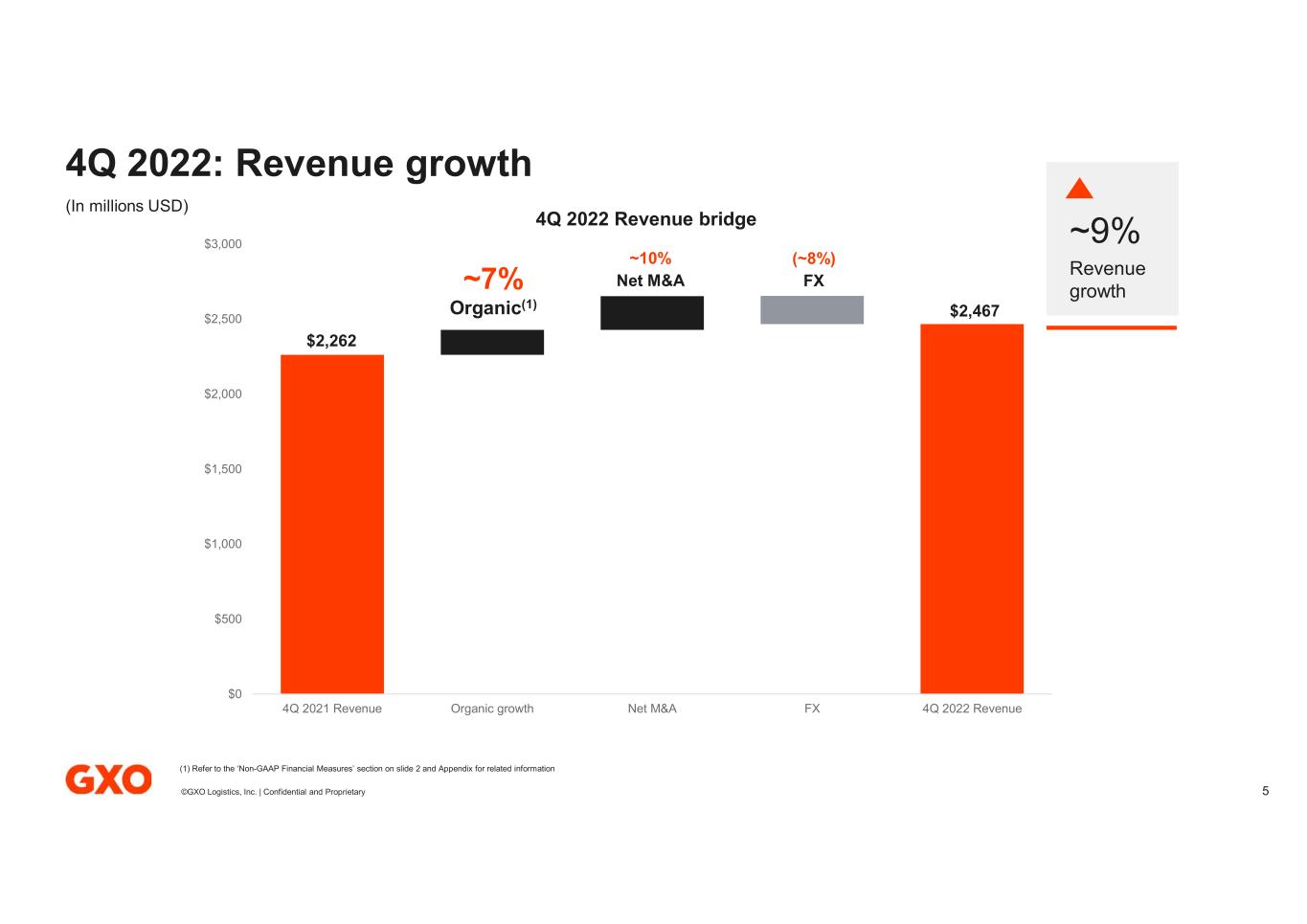 4©GXO Logistics, Inc. | Confidential and Proprietary Highlights Revenue Organic revenue growth(1) Net income(2) Adjusted EBITDA(1) $2.5 billion 7.5% $46 million $205 million • New business wins in 4Q expected to generate $182 million of annualized revenue(3). • $661 million of new FY 2023 revenue won through 4Q 2022, equivalent to 7% YoY revenue growth(3). • 4Q 2022 Adjusted EBITDA of $205 million compared to $167 million in 4Q 2021. Adjusted EBITDA of $728 million in FY 2022 compared to pro forma Adjusted EBITDA of $633 million in FY 2021(1). • 2022 Adjusted EBITDAR of $1,646 million(5). • Diluted EPS $0.39 in 4Q 2022. Adjusted Diluted EPS of $0.83 in 4Q 2022, compared to $0.73 in 4Q 2021(1). FY 2022 Adjusted Diluted EPS $2.85 compared to $2.09 in FY 20221(1). • Free cash flow $141 million in 4Q 2022 compared to $137 million in 4Q 2021 and $240 million in FY 2022 compared to $216 million in FY 2021(1). • Operating return on invested capital well above target 30%(1). • Announced 2027 financial targets of ~$17 billion of revenue and ~$1.6 billion of Adjusted EBITDA at investor day in January 2023 (4). Free cash flow(1) $141 million (1) Refer to the ‘Non-GAAP Financial Measures’ and ‘Non-GAAP Valuation Measures’ section on slide 2 and Appendix for related information (2) Net income attributable to GXO (3) Based off closing December 31 2022 FX rates of 1.21 GBPUSD and 1.07 EURUSD (4) Based on 2021 FX rates (5) Adjusted EBITDAR is a valuation measure that is not specified in GAAP. Adjusted EBITDAR is commonly used by management, research analysts and Investors to value companies in the logistics industry. Adjusted EBITDAR should not be construed as a financial performance or operating measure Operating cash flow $226 million 4Q 2022 FY 2022 $9.0 billion 15.4% $197 million $728 million $240 million $542 million