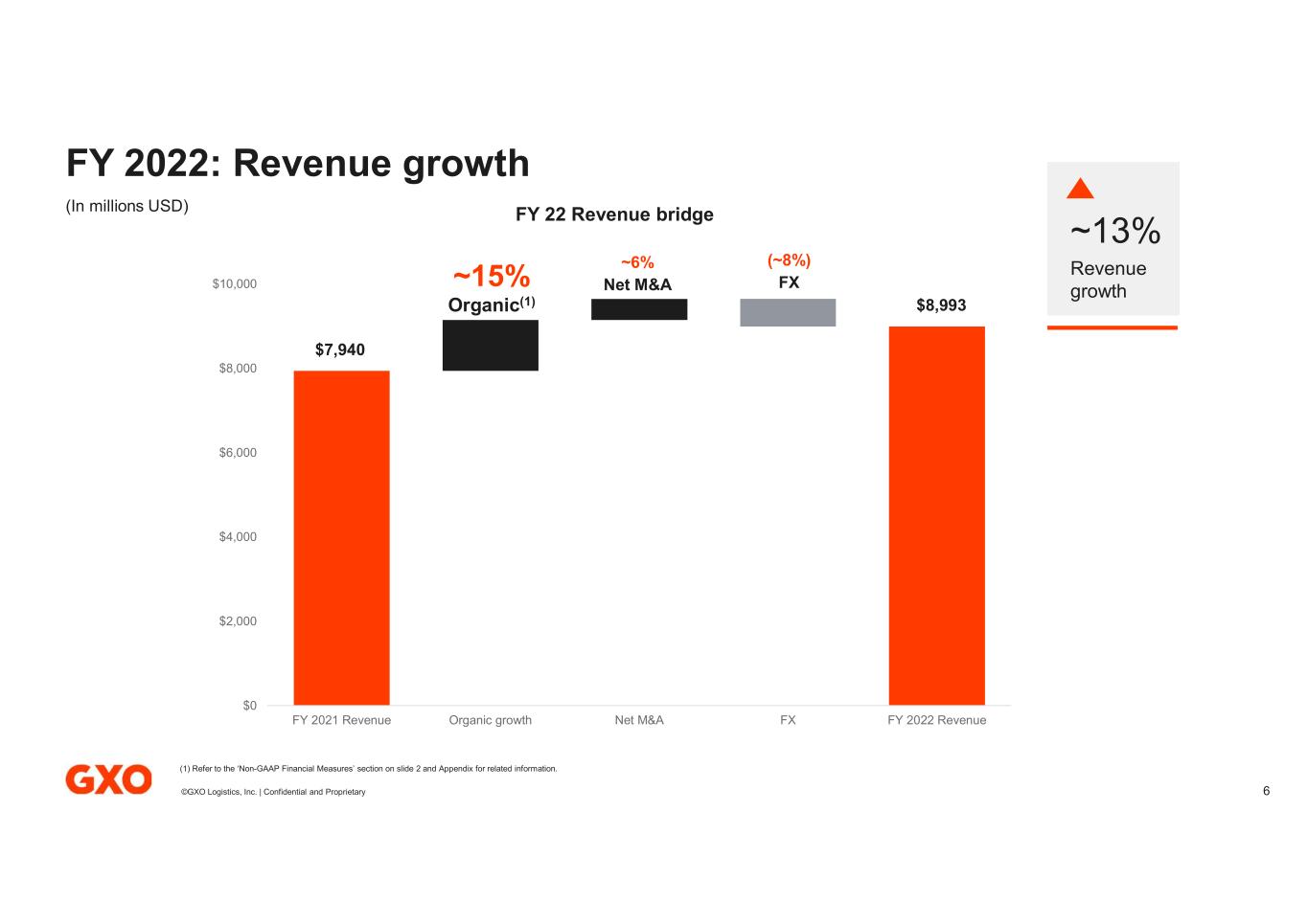5©GXO Logistics, Inc. | Confidential and Proprietary $0 $500 $1,000 $1,500 $2,000 $2,500 $3,000 4Q 2021 Revenue Organic growth Net M&A FX 4Q 2022 Revenue 4Q 2022 Revenue bridge 4Q 2022: Revenue growth ~7% Organic(1) ~10% Net M&A (~8%) FX ~9% Revenue growth (1) Refer to the ‘Non-GAAP Financial Measures’ section on slide 2 and Appendix for related information (In millions USD) $2,262 $2,467
