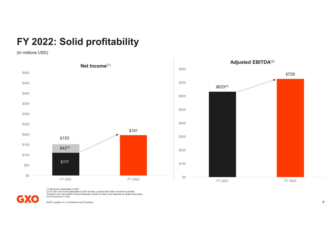 7©GXO Logistics, Inc. | Confidential and Proprietary 0 50 100 150 200 250 4Q 2021 4Q 2022 Adjusted EBITDA(2) $0 $50 $100 $150 $200 $250 4Q 2021 4Q 2022 Net Income(1) 4Q 2022: Solid profitability (In millions USD) (1) Net Income attributable to GXO (2) Refer to the ‘Non-GAAP Financial Measures’ section on slide 2 and Appendix for related information. $167 $205 $56 $46