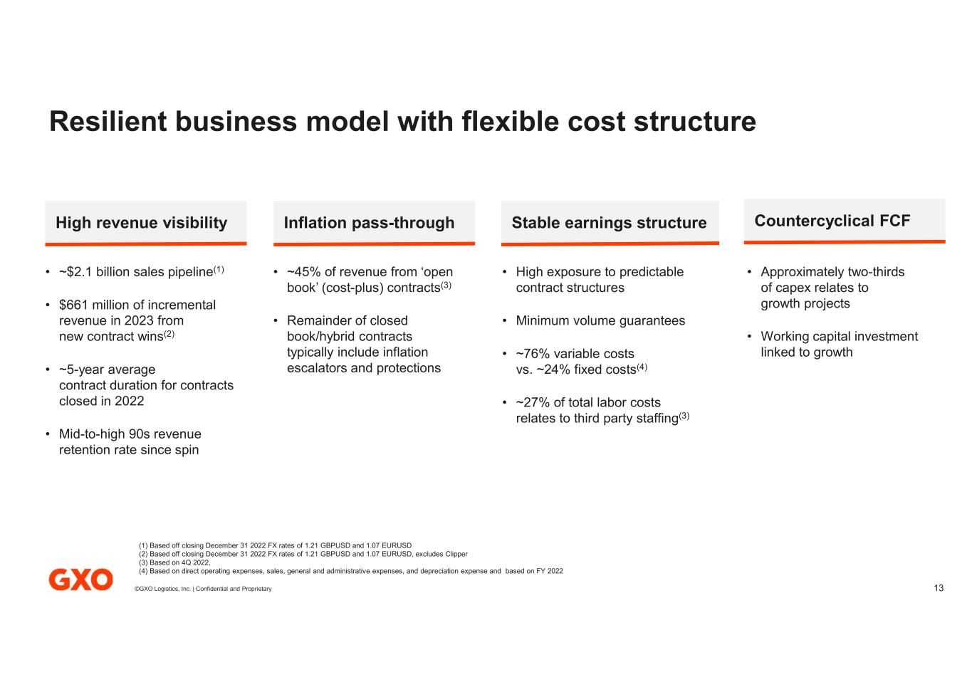 12©GXO Logistics, Inc. | Confidential and Proprietary Diversified revenue in 4Q 2022 12 GXO revenue by vertical 4Q 2022 15% Technology and consumer electronics 42% Omnichannel retail 13% Food and beverage 11% Industrial and manufacturing 10% Consumer packaged goods 9% Other