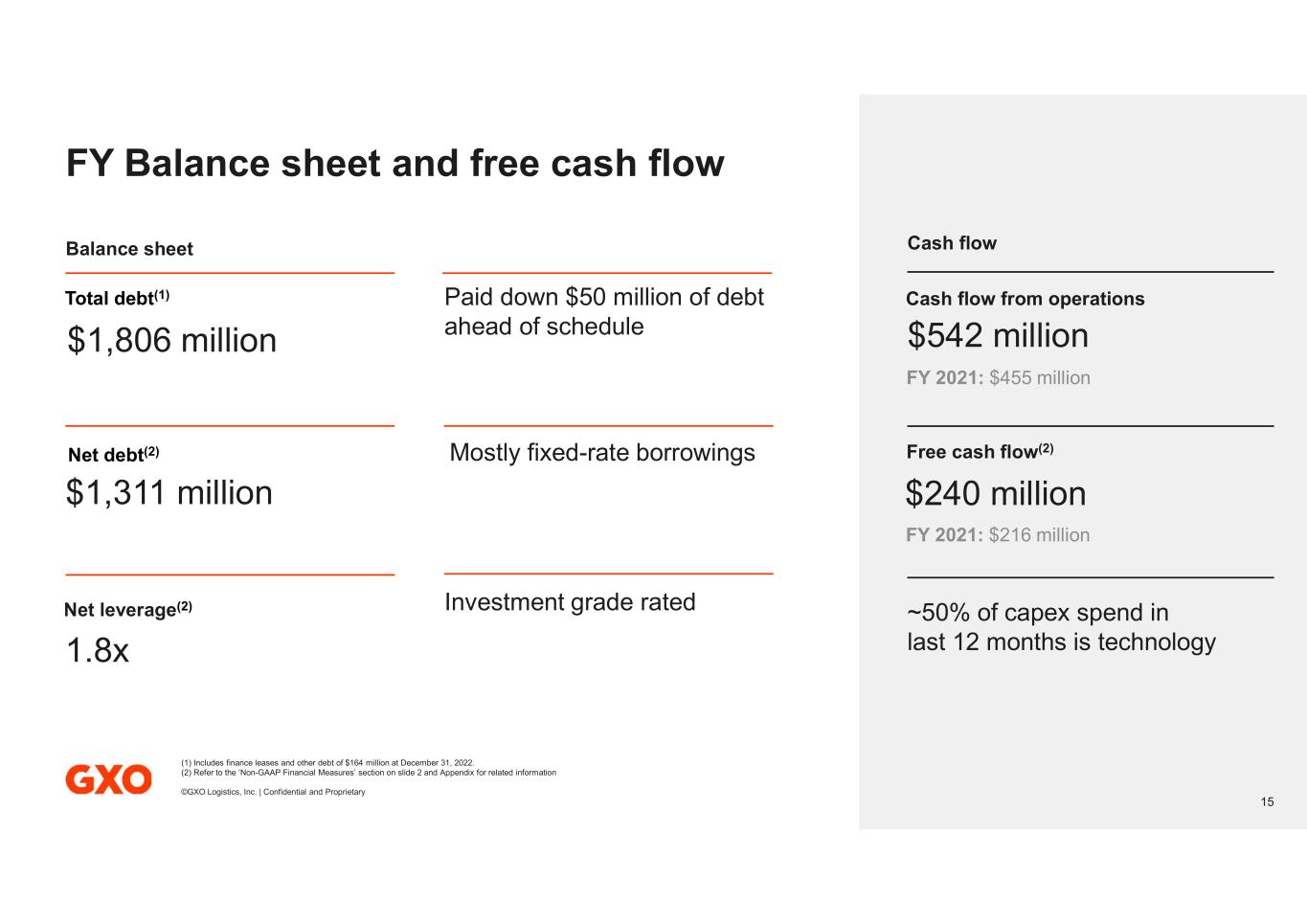 14©GXO Logistics, Inc. | Confidential and Proprietary 4Q 2021 4Q 2022 Vision tech 4Q 2021 4Q 2022 Cobots 4Q 2021 4Q 2022 Goods-to-person systems 4Q 2021 4Q 2022 Total technology and automated systems 2 Accelerating automation and adaptive technology leadership ~30% of 4Q 2022 revenue is from automated sites Accelerating technology deployment is driving revenue growth +40% +14% +92% +76%