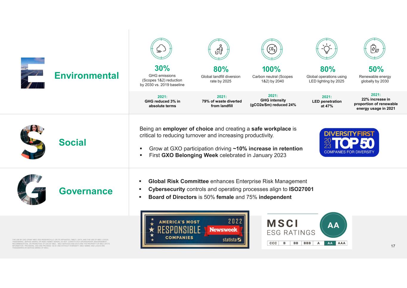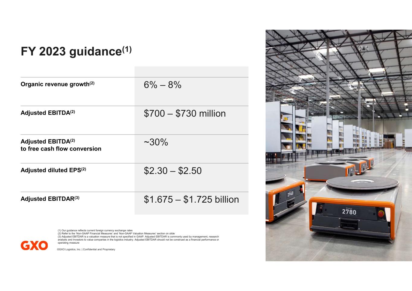16©GXO Logistics, Inc. | Confidential and Proprietary FY 2023 guidance(1) Organic revenue growth(2) 6% – 8% Adjusted EBITDA(2) $700 – $730 million Adjusted EBITDA(2) to free cash flow conversion ~30% Adjusted diluted EPS(2) $2.30 – $2.50 Adjusted EBITDAR(3) $1.675 – $1.725 billion (1) Our guidance reflects current foreign currency exchange rates (2) Refer to the ‘Non-GAAP Financial Measures’ and ‘Non-GAAP Valuation Measures’ section on slide (3) Adjusted EBITDAR is a valuation measure that is not specified in GAAP. Adjusted EBITDAR is commonly used by management, research analysts and Investors to value companies in the logistics industry. Adjusted EBITDAR should not be construed as a financial performance or operating measure