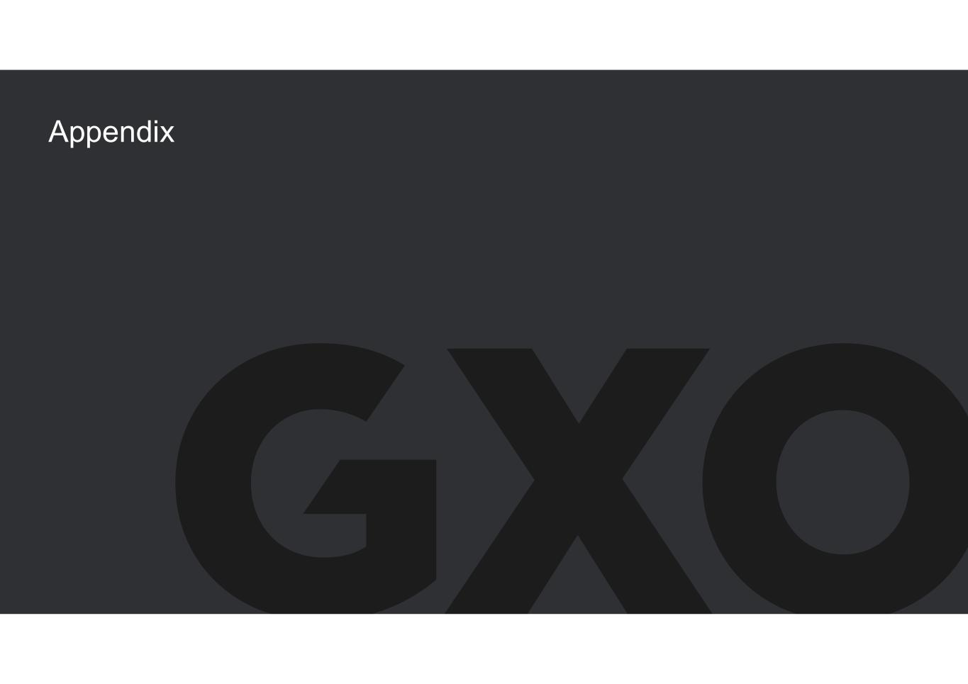 23©GXO Logistics, Inc. | Confidential and Proprietary GXO Logistics, Inc. Liquidity Reconciliations (Unaudited) Reconciliation of Total Debt and Net Debt: (In millions) December 31, 2022 Short-term debt $ 67 Long-term debt 1,739 Total Debt $ 1,806 Less: Cash and cash equivalents (495) Net debt(1) $ 1,311 (1) See the “Non-GAAP Financial Measures” section for additional information. Reconciliation of Net Leverage Ratio: (In millions) December 31, 2022 Net debt $ 1,311 Adjusted EBITDA(1) $ 728 Net leverage ratio(1) 1.8x (1) See the “Non-GAAP Financial Measures” section for additional information. Reconciliation of Total debt to Net Income attributable to GXO Ratio: (In millions) December 31, 2022 Total debt $ 1,806 Net income attributable to GXO $ 197 Debt to net income attributable to GXO ratio 9.2x