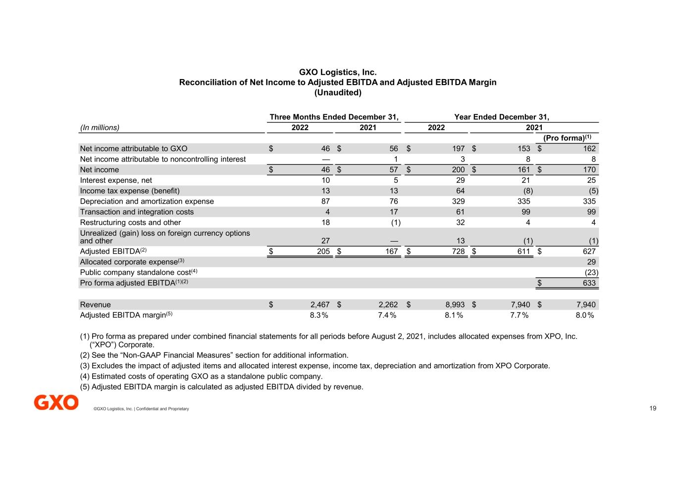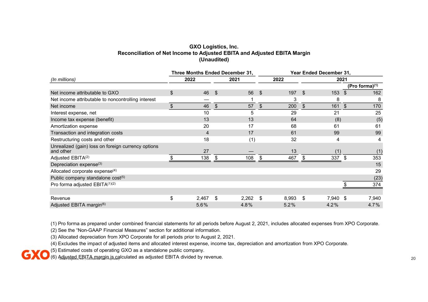 19©GXO Logistics, Inc. | Confidential and Proprietary Three Months Ended December 31, Year Ended December 31, (In millions) 2022 2021 2022 2021 (Pro forma)(1) Net income attributable to GXO $ 46 $ 56 $ 197 $ 153 $ 162 Net income attributable to noncontrolling interest — 1 3 8 8 Net income $ 46 $ 57 $ 200 $ 161 $ 170 Interest expense, net 10 5 29 21 25 Income tax expense (benefit) 13 13 64 (8) (5) Depreciation and amortization expense 87 76 329 335 335 Transaction and integration costs 4 17 61 99 99 Restructuring costs and other 18 (1) 32 4 4 Unrealized (gain) loss on foreign currency options and other 27 — 13 (1) (1) Adjusted EBITDA(2) $ 205 $ 167 $ 728 $ 611 $ 627 Allocated corporate expense(3) 29 Public company standalone cost(4) (23) Pro forma adjusted EBITDA(1)(2) $ 633 Revenue $ 2,467 $ 2,262 $ 8,993 $ 7,940 $ 7,940 Adjusted EBITDA margin(5) 8.3% 7.4% 8.1% 7.7% 8.0% (1) Pro forma as prepared under combined financial statements for all periods before August 2, 2021, includes allocated expenses from XPO, Inc. (“XPO”) Corporate. (2) See the “Non-GAAP Financial Measures” section for additional information. (3) Excludes the impact of adjusted items and allocated interest expense, income tax, depreciation and amortization from XPO Corporate. (4) Estimated costs of operating GXO as a standalone public company. (5) Adjusted EBITDA margin is calculated as adjusted EBITDA divided by revenue. GXO Logistics, Inc. Reconciliation of Net Income to Adjusted EBITDA and Adjusted EBITDA Margin (Unaudited)