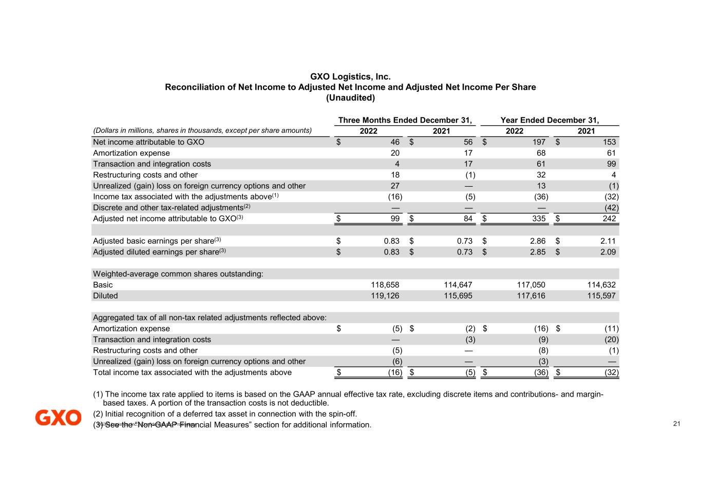 20©GXO Logistics, Inc. | Confidential and Proprietary Three Months Ended December 31, Year Ended December 31, (In millions) 2022 2021 2022 2021 (Pro forma)(1) Net income attributable to GXO $ 46 $ 56 $ 197 $ 153 $ 162 Net income attributable to noncontrolling interest — 1 3 8 8 Net income $ 46 $ 57 $ 200 $ 161 $ 170 Interest expense, net 10 5 29 21 25 Income tax expense (benefit) 13 13 64 (8) (5) Amortization expense 20 17 68 61 61 Transaction and integration costs 4 17 61 99 99 Restructuring costs and other 18 (1) 32 4 4 Unrealized (gain) loss on foreign currency options and other 27 — 13 (1) (1) Adjusted EBITA(2) $ 138 $ 108 $ 467 $ 337 $ 353 Depreciation expense(3) 15 Allocated corporate expense(4) 29 Public company standalone cost(5) (23) Pro forma adjusted EBITA(1)(2) $ 374 Revenue $ 2,467 $ 2,262 $ 8,993 $ 7,940 $ 7,940 Adjusted EBITA margin(6) 5.6% 4.8% 5.2% 4.2% 4.7% (1) Pro forma as prepared under combined financial statements for all periods before August 2, 2021, includes allocated expenses from XPO Corporate. (2) See the “Non-GAAP Financial Measures” section for additional information. (3) Allocated depreciation from XPO Corporate for all periods prior to August 2, 2021. (4) Excludes the impact of adjusted items and allocated interest expense, income tax, depreciation and amortization from XPO Corporate. (5) Estimated costs of operating GXO as a standalone public company. (6) Adjusted EBITA margin is calculated as adjusted EBITA divided by revenue. GXO Logistics, Inc. Reconciliation of Net Income to Adjusted EBITA and Adjusted EBITA Margin (Unaudited)