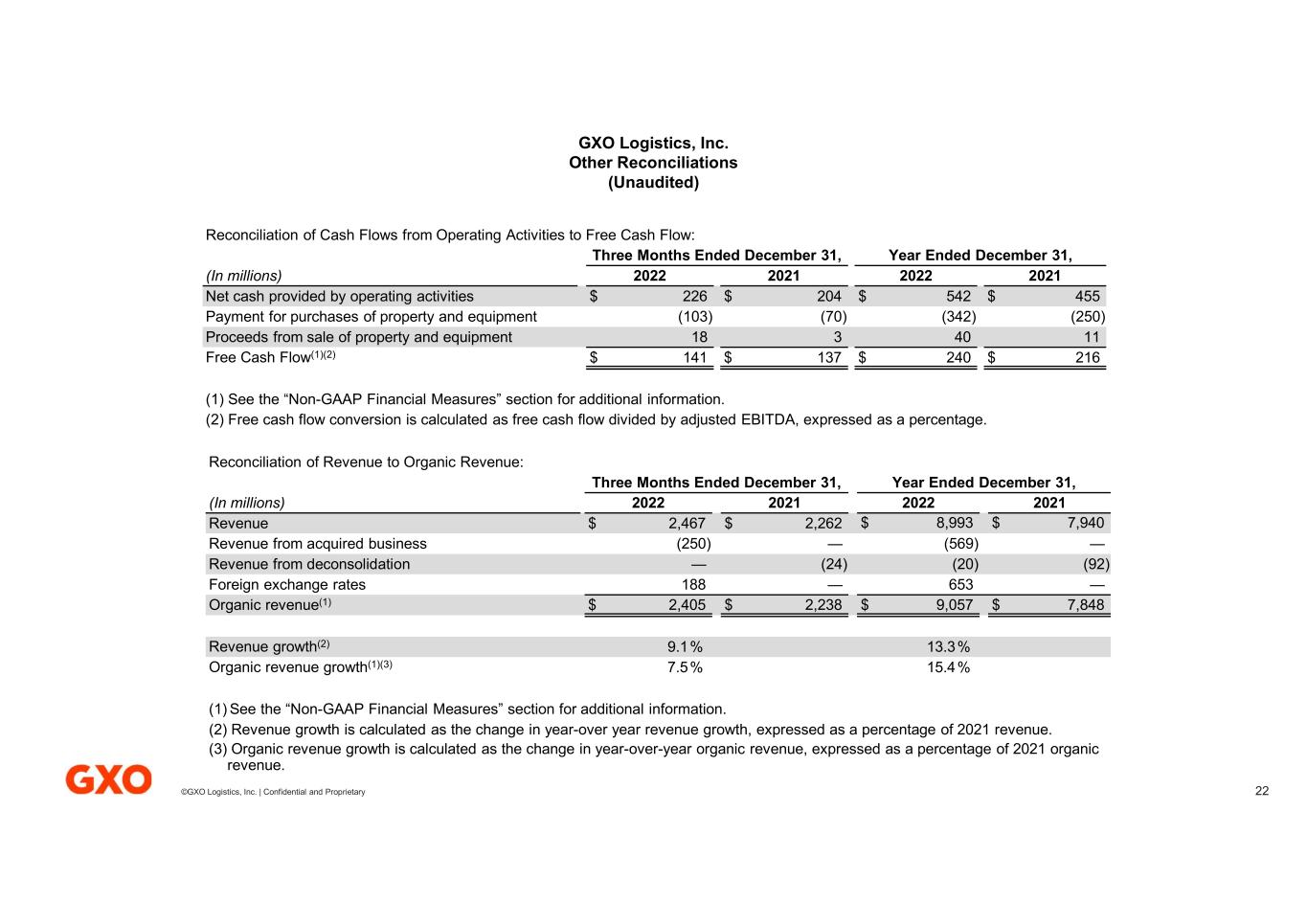 22©GXO Logistics, Inc. | Confidential and Proprietary GXO Logistics, Inc. Other Reconciliations (Unaudited) Reconciliation of Cash Flows from Operating Activities to Free Cash Flow: Three Months Ended December 31, Year Ended December 31, (In millions) 2022 2021 2022 2021 Net cash provided by operating activities $ 226 $ 204 $ 542 $ 455 Payment for purchases of property and equipment (103) (70) (342) (250) Proceeds from sale of property and equipment 18 3 40 11 Free Cash Flow(1)(2) $ 141 $ 137 $ 240 $ 216 (1) See the “Non-GAAP Financial Measures” section for additional information. (2) Free cash flow conversion is calculated as free cash flow divided by adjusted EBITDA, expressed as a percentage. Reconciliation of Revenue to Organic Revenue: Three Months Ended December 31, Year Ended December 31, (In millions) 2022 2021 2022 2021 Revenue $ 2,467 $ 2,262 $ 8,993 $ 7,940 Revenue from acquired business (250) — (569) — Revenue from deconsolidation — (24) (20) (92) Foreign exchange rates 188 — 653 — Organic revenue(1) $ 2,405 $ 2,238 $ 9,057 $ 7,848 Revenue growth(2) 9.1% 13.3% Organic revenue growth(1)(3) 7.5% 15.4% (1) See the “Non-GAAP Financial Measures” section for additional information. (2) Revenue growth is calculated as the change in year-over year revenue growth, expressed as a percentage of 2021 revenue. (3) Organic revenue growth is calculated as the change in year-over-year organic revenue, expressed as a percentage of 2021 organic revenue.