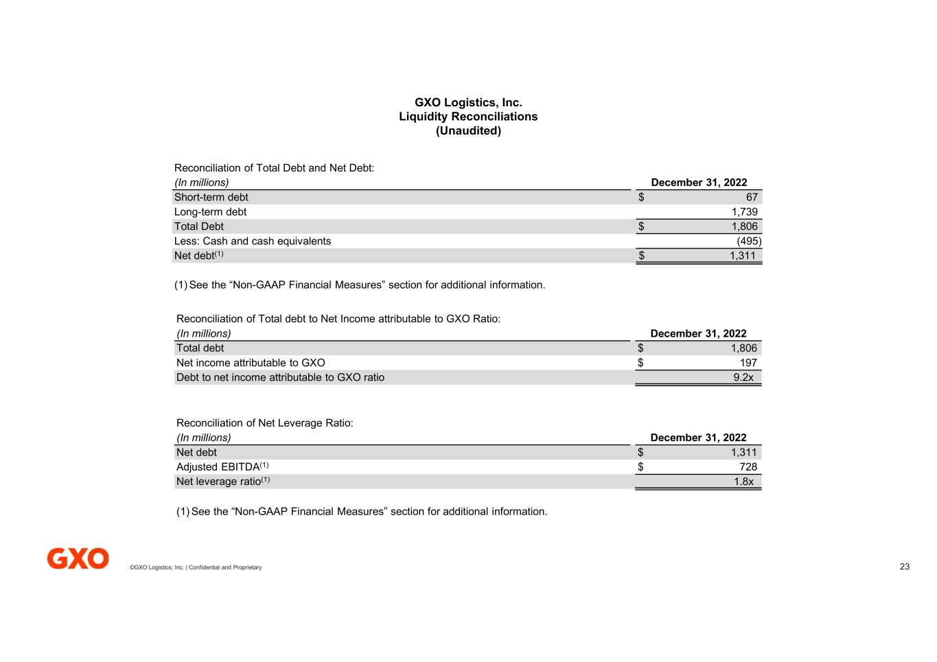 21©GXO Logistics, Inc. | Confidential and Proprietary Three Months Ended December 31, Year Ended December 31, (Dollars in millions, shares in thousands, except per share amounts) 2022 2021 2022 2021 Net income attributable to GXO $ 46 $ 56 $ 197 $ 153 Amortization expense 20 17 68 61 Transaction and integration costs 4 17 61 99 Restructuring costs and other 18 (1) 32 4 Unrealized (gain) loss on foreign currency options and other 27 — 13 (1) Income tax associated with the adjustments above(1) (16) (5) (36) (32) Discrete and other tax-related adjustments(2) — — — (42) Adjusted net income attributable to GXO(3) $ 99 $ 84 $ 335 $ 242 Adjusted basic earnings per share(3) $ 0.83 $ 0.73 $ 2.86 $ 2.11 Adjusted diluted earnings per share(3) $ 0.83 $ 0.73 $ 2.85 $ 2.09 Weighted-average common shares outstanding: Basic 118,658 114,647 117,050 114,632 Diluted 119,126 115,695 117,616 115,597 Aggregated tax of all non-tax related adjustments reflected above: Amortization expense $ (5) $ (2) $ (16) $ (11) Transaction and integration costs — (3) (9) (20) Restructuring costs and other (5) — (8) (1) Unrealized (gain) loss on foreign currency options and other (6) — (3) — Total income tax associated with the adjustments above $ (16) $ (5) $ (36) $ (32) (1) The income tax rate applied to items is based on the GAAP annual effective tax rate, excluding discrete items and contributions- and margin- based taxes. A portion of the transaction costs is not deductible. (2) Initial recognition of a deferred tax asset in connection with the spin-off. (3) See the “Non-GAAP Financial Measures” section for additional information. GXO Logistics, Inc. Reconciliation of Net Income to Adjusted Net Income and Adjusted Net Income Per Share (Unaudited)
