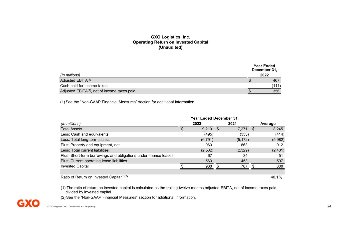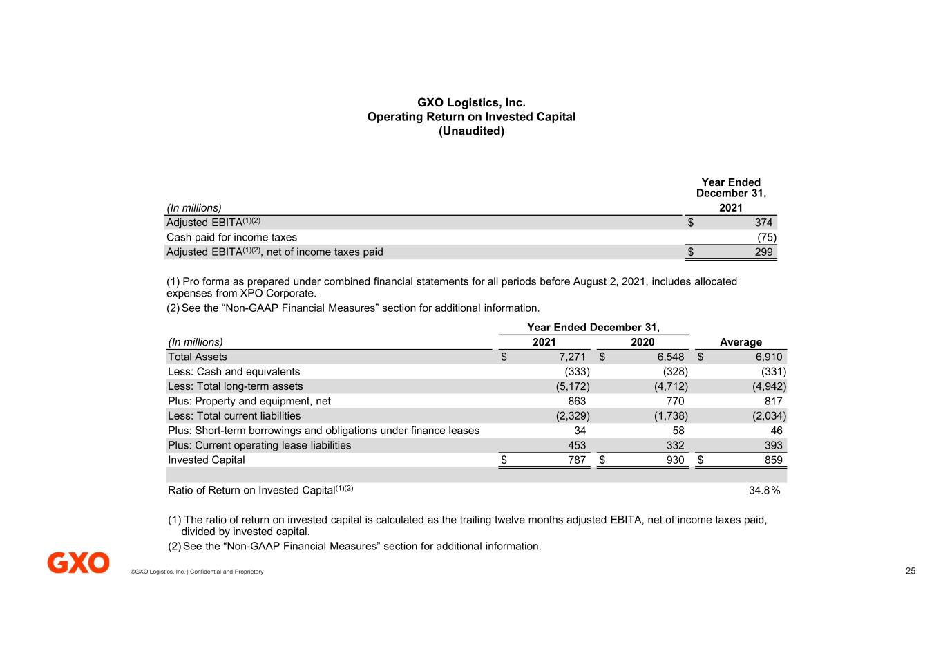 24©GXO Logistics, Inc. | Confidential and Proprietary Year Ended December 31, (In millions) 2022 Adjusted EBITA(1) $ 467 Cash paid for income taxes (111) Adjusted EBITA(1), net of income taxes paid $ 356 (1) See the “Non-GAAP Financial Measures” section for additional information. Year Ended December 31, (In millions) 2022 2021 Average Total Assets $ 9,219 $ 7,271 $ 8,245 Less: Cash and equivalents (495) (333) (414) Less: Total long-term assets (6,791) (5,172) (5,982) Plus: Property and equipment, net 960 863 912 Less: Total current liabilities (2,532) (2,329) (2,431) Plus: Short-term borrowings and obligations under finance leases 67 34 51 Plus: Current operating lease liabilities 560 453 507 Invested Capital $ 988 $ 787 $ 888 Ratio of Return on Invested Capital(1)(2) 40.1% (1) The ratio of return on invested capital is calculated as the trailing twelve months adjusted EBITA, net of income taxes paid, divided by invested capital. (2) See the “Non-GAAP Financial Measures” section for additional information. GXO Logistics, Inc. Operating Return on Invested Capital (Unaudited)