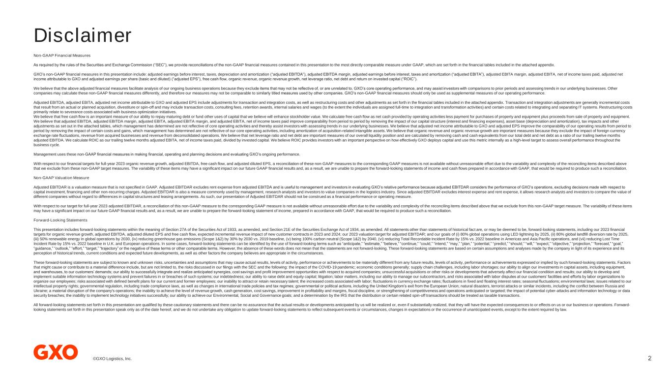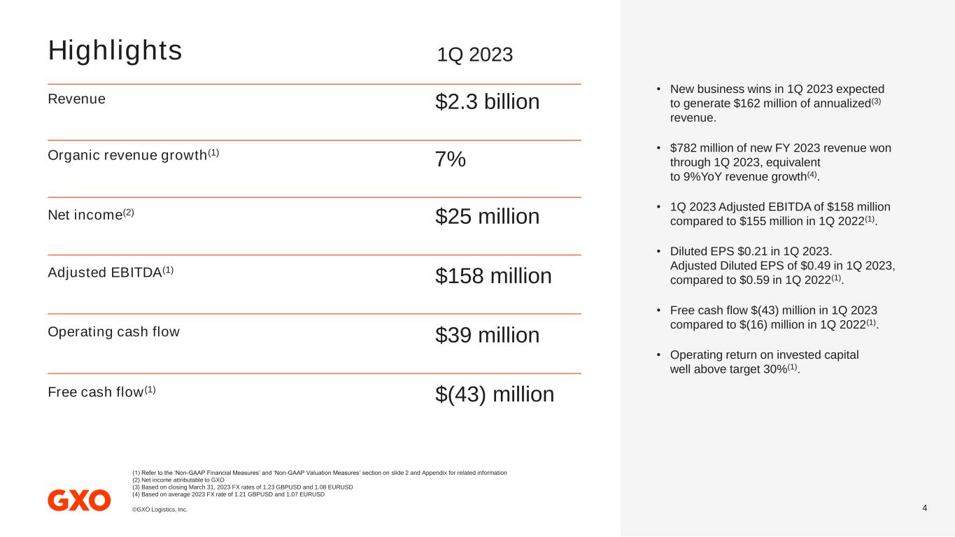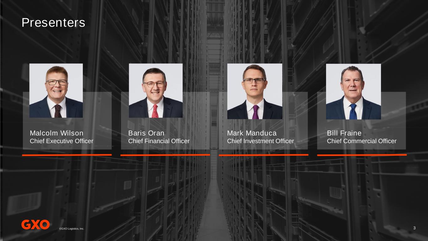 2©GXO Logistics, Inc. Disclaimer 2 Non-GAAP Financial Measures As required by the rules of the Securities and Exchange Commission (“SEC”), we provide reconciliations of the non-GAAP financial measures contained in this presentation to the most directly comparable measure under GAAP, which are set forth in the financial tables included in the attached appendix. GXO’s non-GAAP financial measures in this presentation include: adjusted earnings before interest, taxes, depreciation and amortization (“adjusted EBITDA”), adjusted EBITDA margin, adjusted earnings before interest, taxes and amortization (“adjusted EBITA”), adjusted EBITA margin, adjusted EBITA, net of income taxes paid, adjusted net income attributable to GXO and adjusted earnings per share (basic and diluted) (“adjusted EPS”), free cash flow, organic revenue, organic revenue growth, net leverage ratio, net debt and return on invested capital (“ROIC”). We believe that the above adjusted financial measures facilitate analysis of our ongoing business operations because they exclude items that may not be reflective of, or are unrelated to, GXO’s core operating performance, and may assist investors with comparisons to prior periods and assessing trends in our underlying businesses. Other companies may calculate these non-GAAP financial measures differently, and therefore our measures may not be comparable to similarly titled measures used by other companies. GXO’s non-GAAP financial measures should only be used as supplemental measures of our operating performance. Adjusted EBITDA, adjusted EBITA, adjusted net income attributable to GXO and adjusted EPS include adjustments for transaction and integration costs, as well as restructuring costs and other adjustments as set forth in the financial tables included in the attached appendix. Transaction and integration adjustments are generally incremental costs that result from an actual or planned acquisition, divestiture or spin-off and may include transaction costs, consulting fees, retention awards, internal salaries and wages (to the extent the individuals are assigned full-time to integration and transformation activities) and certain costs related to integrating and separating IT systems. Restructuring costs primarily relate to severance costs associated with business optimization initiatives. We believe that free cash flow is an important measure of our ability to repay maturing debt or fund other uses of capital that we believe will enhance stockholder value. We calculate free cash flow as net cash provided by operating activities less payment for purchases of property and equipment plus proceeds from sale of property and equipment. We believe that adjusted EBITDA, adjusted EBITDA margin, adjusted EBITA, adjusted EBITA margin, and adjusted EBITA, net of income taxes paid improve comparability from period to period by removing the impact of our capital structure (interest and financing expenses), asset base (depreciation and amortization), tax impacts and other adjustments as set out in the attached tables, which management has determined are not reflective of core operating activities and thereby assist investors with assessing trends in our underlying businesses. We believe that adjusted net income attributable to GXO and adjusted EPS improve the comparability of our operating results from period to period by removing the impact of certain costs and gains, which management has determined are not reflective of our core operating activities, including amortization of acquisition-related intangible assets. We believe that organic revenue and organic revenue growth are important measures because they exclude the impact of foreign currency exchange rate fluctuations, revenue from acquired businesses and revenue from deconsolidated operations. We believe that net leverage ratio and net debt are important measures of our overall liquidity position and are calculated by removing cash and cash equivalents from our total debt and net debt as a ratio of our trailing twelve months adjusted EBITDA. We calculate ROIC as our trailing twelve months adjusted EBITA, net of income taxes paid, divided by invested capital. We believe ROIC provides investors with an important perspective on how effectively GXO deploys capital and use this metric internally as a high-level target to assess overall performance throughout the business cycle. Management uses these non-GAAP financial measures in making financial, operating and planning decisions and evaluating GXO’s ongoing performance. With respect to our financial targets for full-year 2023 organic revenue growth, adjusted EBITDA, free cash flow, and adjusted diluted EPS, a reconciliation of these non-GAAP measures to the corresponding GAAP measures is not available without unreasonable effort due to the variability and complexity of the reconciling items described above that we exclude from these non-GAAP target measures. The variability of these items may have a significant impact on our future GAAP financial results and, as a result, we are unable to prepare the forward-looking statements of income and cash flows prepared in accordance with GAAP, that would be required to produce such a reconciliation. Non-GAAP Valuation Measure Adjusted EBITDAR is a valuation measure that is not specified in GAAP. Adjusted EBITDAR excludes rent expense from adjusted EBITDA and is useful to management and investors in evaluating GXO’s relative performance because adjusted EBITDAR considers the performance of GXO’s operations, excluding decisions made with respect to capital investment, financing and other non-recurring charges. Adjusted EBITDAR is also a measure commonly used by management, research analysts and investors to value companies in the logistics industry. Since adjusted EBITDAR excludes interest expense and rent expense, it allows research analysts and investors to compare the value of different companies without regard to d