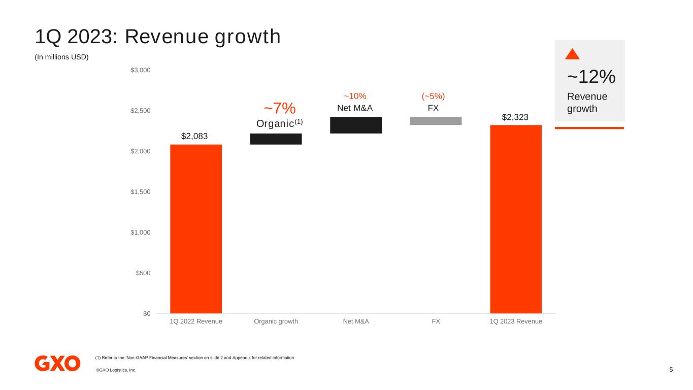 4©GXO Logistics, Inc. Highlights Revenue Organic revenue growth(1) Net income(2) Adjusted EBITDA(1) • New business wins in 1Q 2023 expected to generate $162 million of annualized(3) revenue. • $782 million of new FY 2023 revenue won through 1Q 2023, equivalent to 9%YoY revenue growth(4). • 1Q 2023 Adjusted EBITDA of $158 million compared to $155 million in 1Q 2022(1). • Diluted EPS $0.21 in 1Q 2023. Adjusted Diluted EPS of $0.49 in 1Q 2023, compared to $0.59 in 1Q 2022(1). • Free cash flow $(43) million in 1Q 2023 compared to $(16) million in 1Q 2022(1). • Operating return on invested capital well above target 30%(1). Free cash flow(1) (1) Refer to the ‘Non-GAAP Financial Measures’ and ‘Non-GAAP Valuation Measures’ section on slide 2 and Appendix for related information (2) Net income attributable to GXO (3) Based on closing March 31, 2023 FX rates of 1.23 GBPUSD and 1.08 EURUSD (4) Based on average 2023 FX rate of 1.21 GBPUSD and 1.07 EURUSD Operating cash flow 1Q 2023 $2.3 billion 7% $25 million $158 million $(43) million $39 million