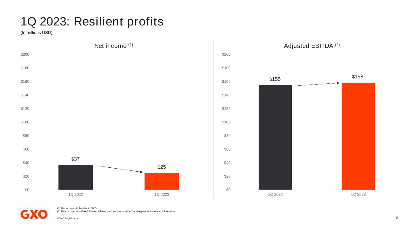 5©GXO Logistics, Inc. $0 $500 $1,000 $1,500 $2,000 $2,500 $3,000 1Q 2022 Revenue Organic growth Net M&A FX 1Q 2023 Revenue 1Q 2023: Revenue growth ~7% Organic(1) ~10% Net M&A (~5%) FX ~12% Revenue growth (1) Refer to the ‘Non-GAAP Financial Measures’ section on slide 2 and Appendix for related information (In millions USD) $2,083 $2,323