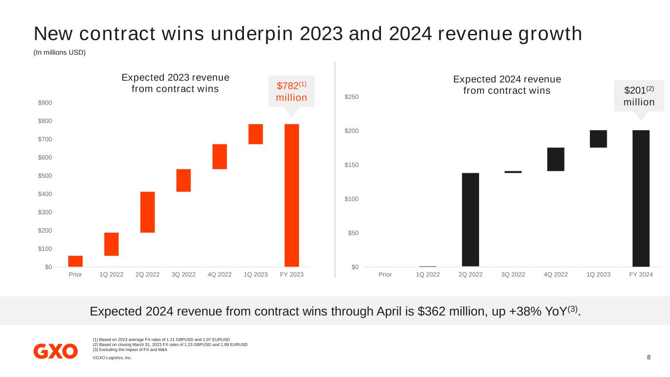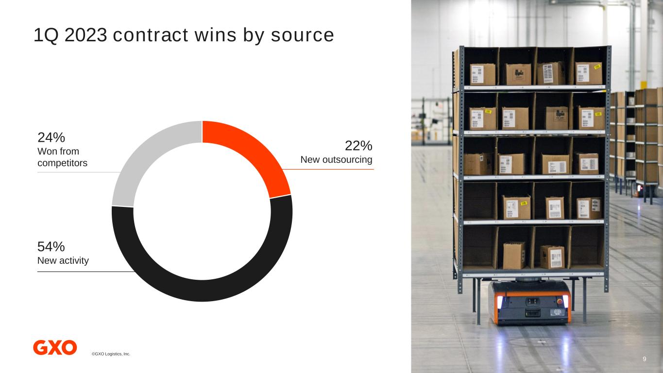 8©GXO Logistics, Inc. $0 $50 $100 $150 $200 $250 Prior 1Q 2022 2Q 2022 3Q 2022 4Q 2022 1Q 2023 FY 2024 Expected 2024 revenue from contract wins $0 $100 $200 $300 $400 $500 $600 $700 $800 $900 Prior 1Q 2022 2Q 2022 3Q 2022 4Q 2022 1Q 2023 FY 2023 Expected 2023 revenue from contract wins Expected 2024 revenue from contract wins through April is $362 million, up +38% YoY(3). New contract wins underpin 2023 and 2024 revenue growth (1) Based on 2023 average FX rates of 1.21 GBPUSD and 1.07 EURUSD (2) Based on closing March 31, 2023 FX rates of 1.23 GBPUSD and 1.08 EURUSD (3) Excluding the impact of FX and M&A $782(1) million $201(2) million (In millions USD)