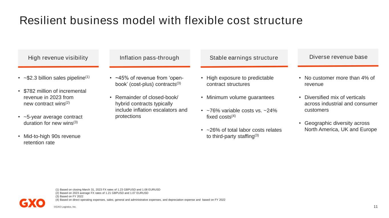 10©GXO Logistics, Inc. Diversified revenue by vertical in 1Q 2023 10 Omnichannel retail Technology and consumer electronics Food and beverage Industrial and manufacturing Consumer packaged goods Other 16% 13% 12% 11% 6%42%